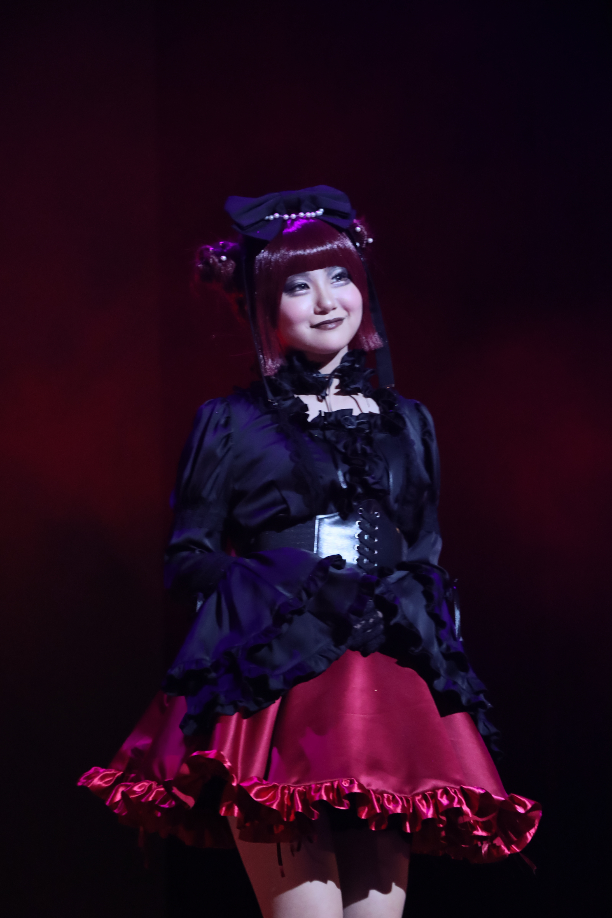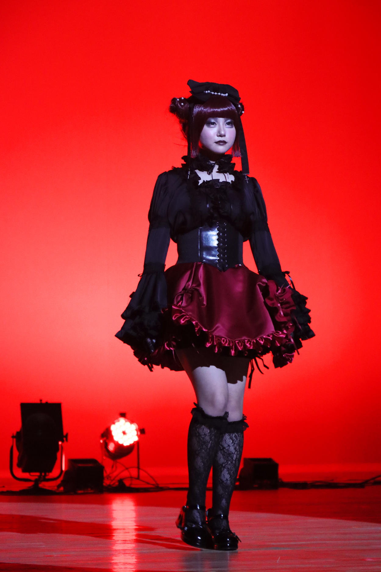 ヘアー:ワインレッドのウィッグを買い高めのツインお団子に重め前髪パッツン、姫カットでお嬢様感を演出しました。