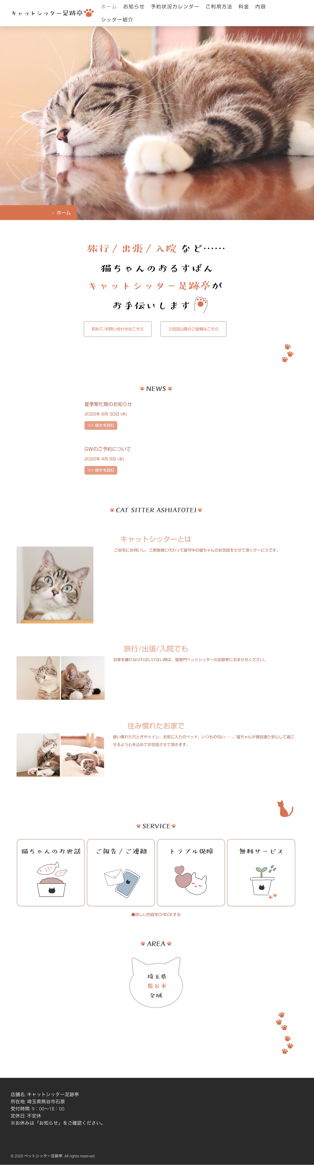 キャットシッター足跡亭 tachibana OVERVIEW WEBサイト・Jimdoo ・デザイン: オレンジと茶系をメインとし、暖かみと親しみやすさを感じられるような配色に。猫ちゃんの画像や手描きのイラストを盛り込むことにより、可愛らしく分かりやすいサイトデザインに。・プログラム: アコーディオンメニューを右手で操作しやすい様、画面右上(モバイル版)に移動させたり、ラジオボタンで表示項目を変更するシステムなど、細部のプログラムを使いやすく調整。 WEBSITE