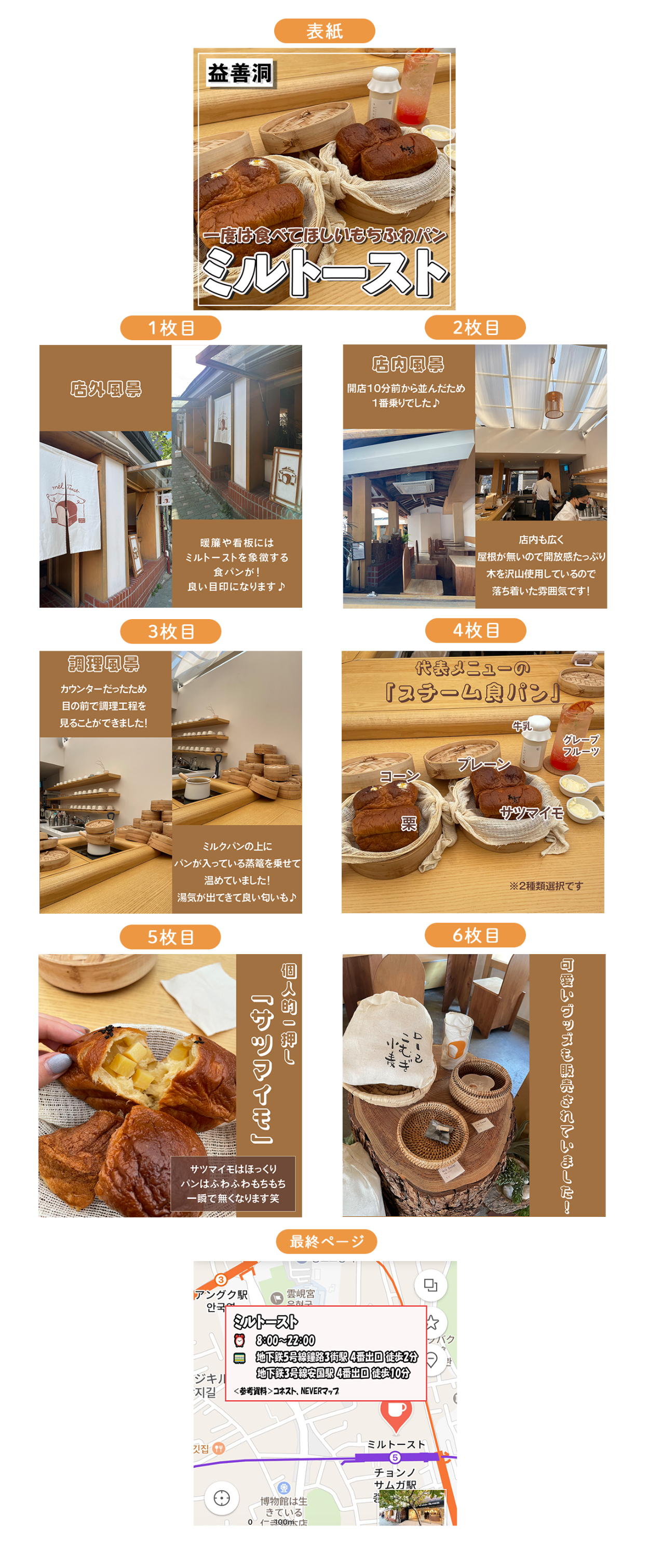 ・見ている人が時系列をイメージしやすいように外観から店内、商品の順に並べました。