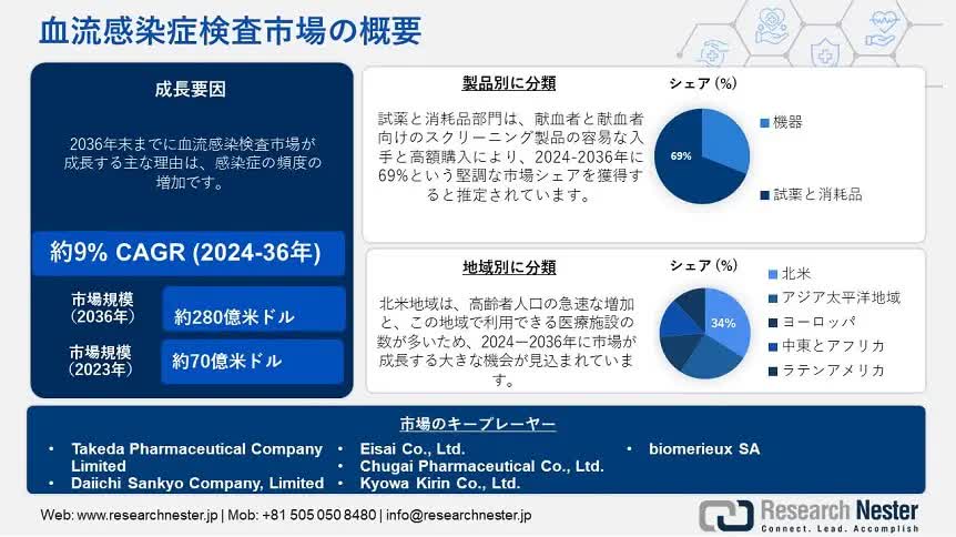 血流感染検査市場調査 2024-2036 成長、市場需要、市場価値、市場シェア、業界予測 Tatsuki Nakamura Market Researcher OVERVIEW 血流感染症検査市場調査 日本の血流感染症検査市場は、2024-2036年の予測期間中に大きなシェアを占めると予測されています。 血流感染症は人口の高齢化に伴って増加する傾向があり、この病気は超高齢者グループで最も蔓延しています。 研究結果によると、感染症相談による早期介入により、高齢者であっても血流感染症の診断が改善される可能性がある。 WEBSITE