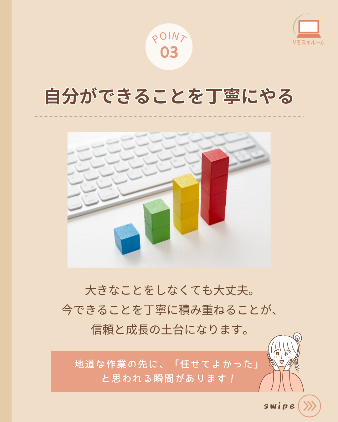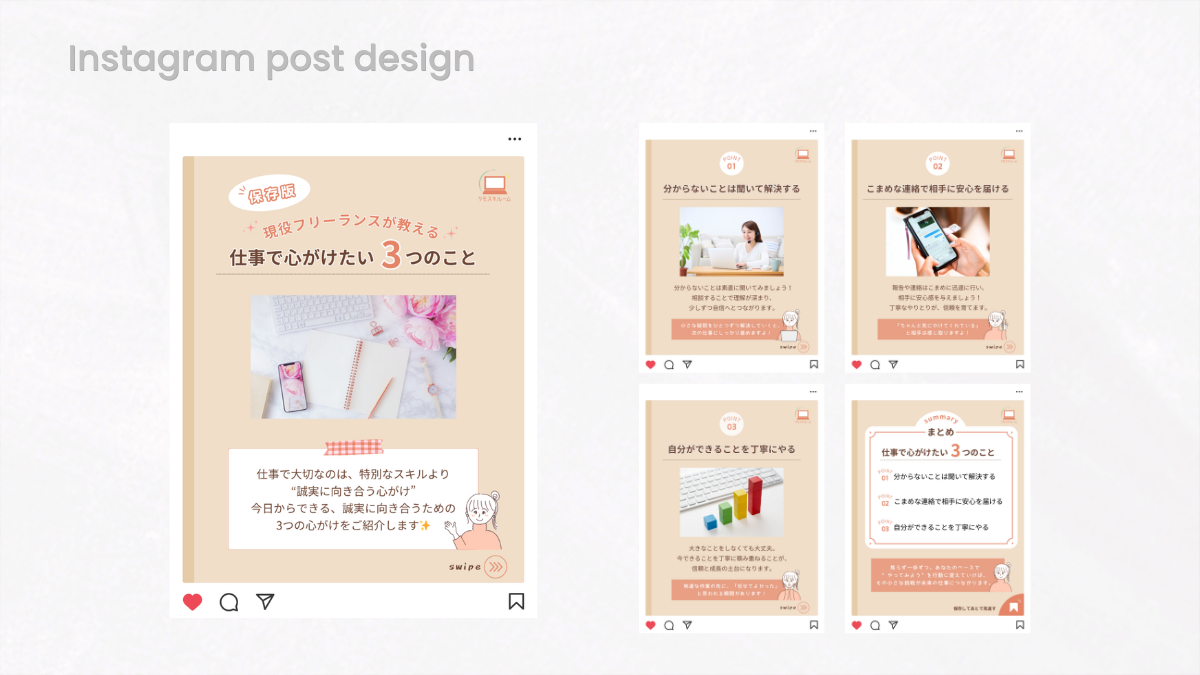 【課題】Instagramのフィード投稿 Mamiko Webデザイン/動画編集/ライティング OVERVIEW リモスキルームのSNSマーケティング課題で、フィード投稿の内容とデザインの制作に取り組みました。 YEAR 2025