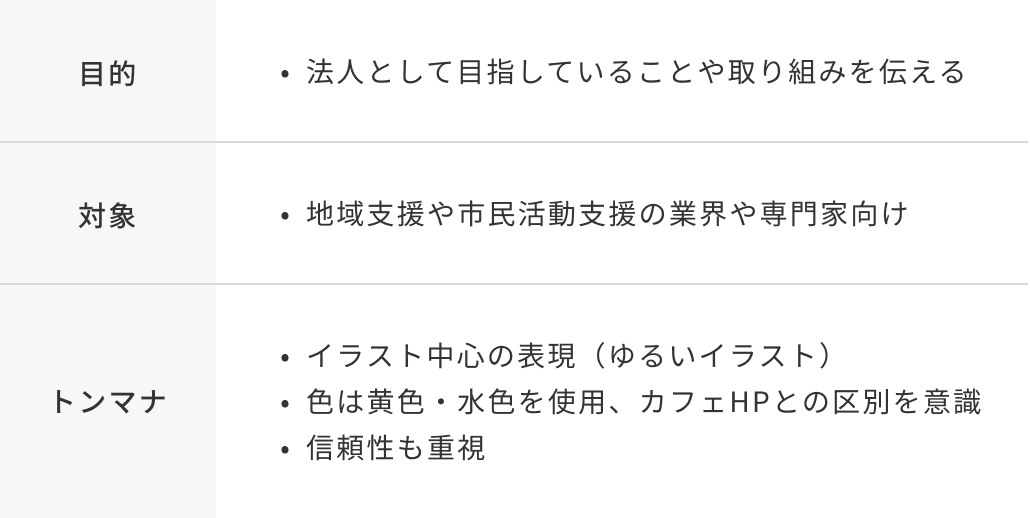 - 既存のカフェサイトの配色(水色・黄色)と調和を取りつつ、法人サイトとして区別できるよう意識