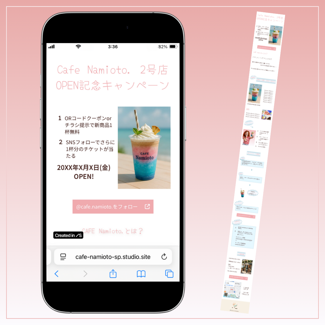 カフェの新店舗Cafe Namioto.2号店(仮)OPEN記念キャンペーンのLPを制作しました。