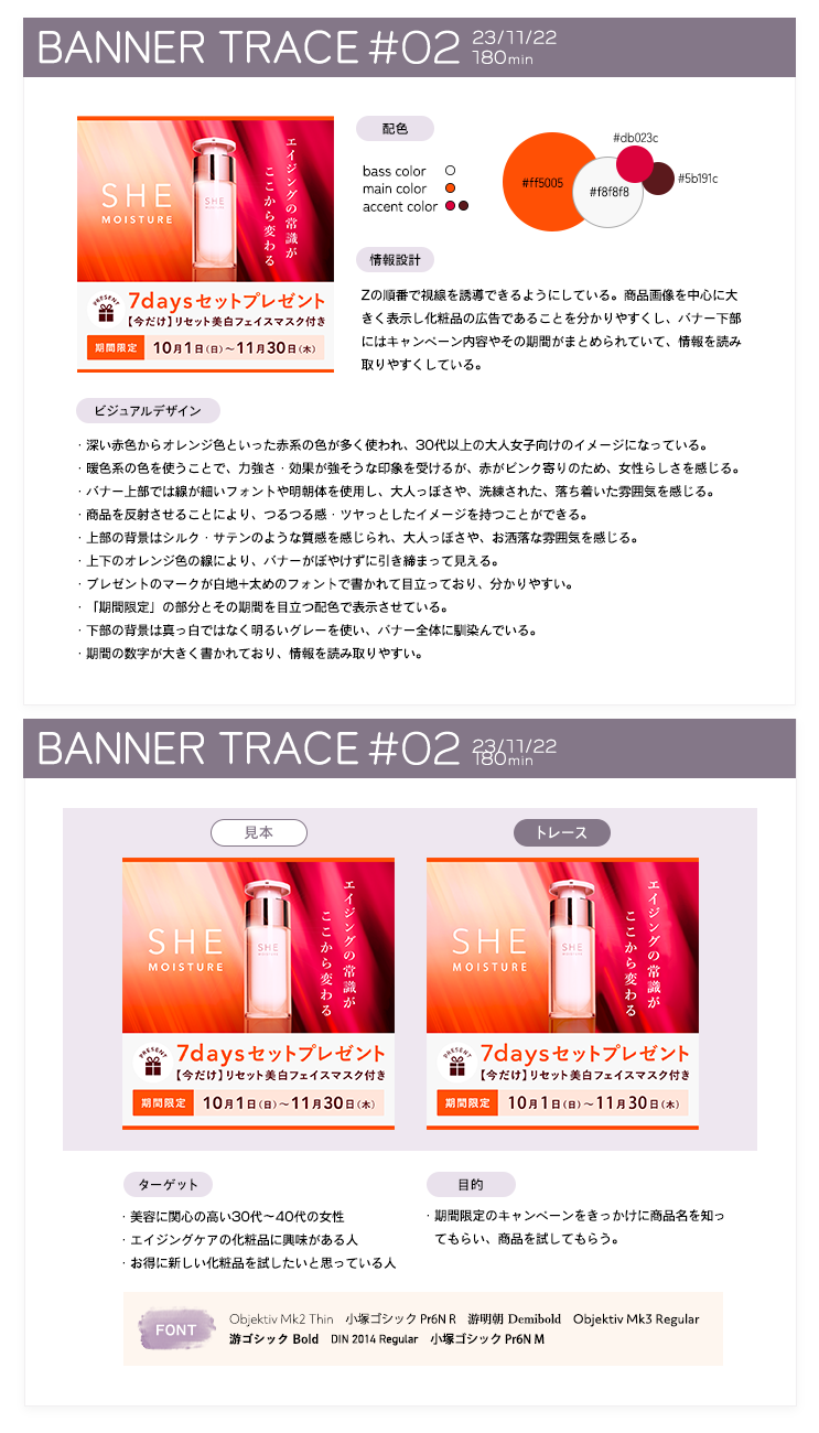 SHElikes MULTI CREATOR COURSE Designer にて、バナートレースの課題に取り組みました。また、「ターゲット」「目的」「配色」等についての分析結果もまとめました。