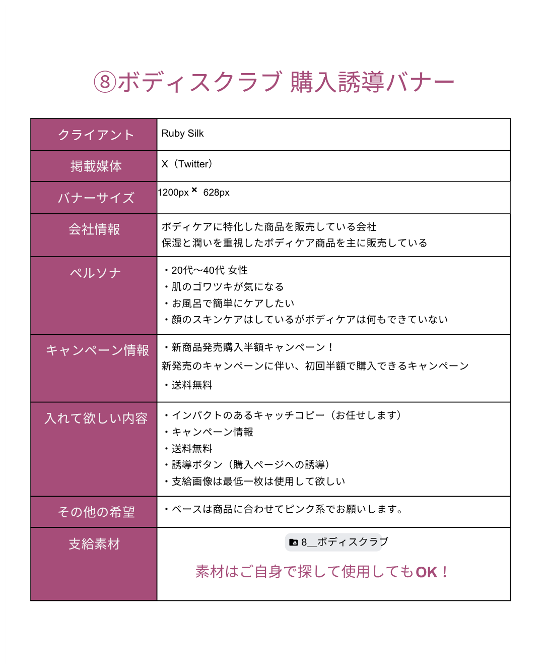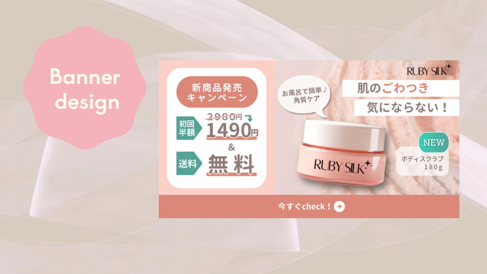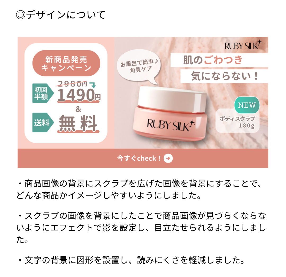 HerTech架空案件にて 20~40代の女性をターゲットにしたボディスクラブの新商品購入誘導バナーを制作しました。 【使用ツール】canva 【制作時間】5時間
