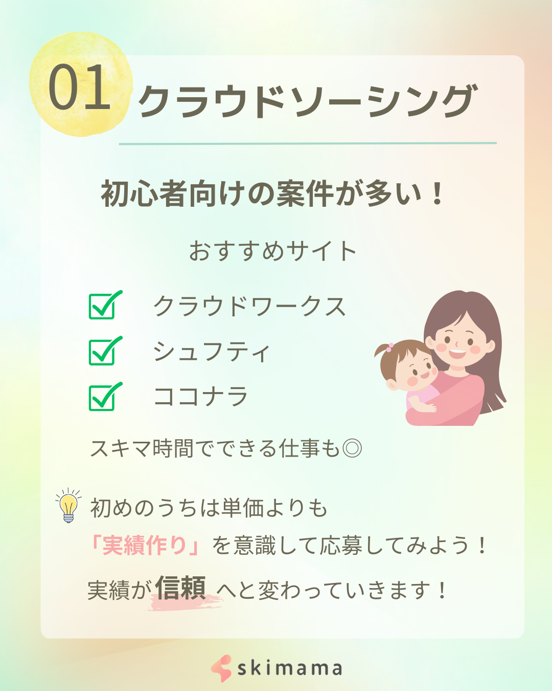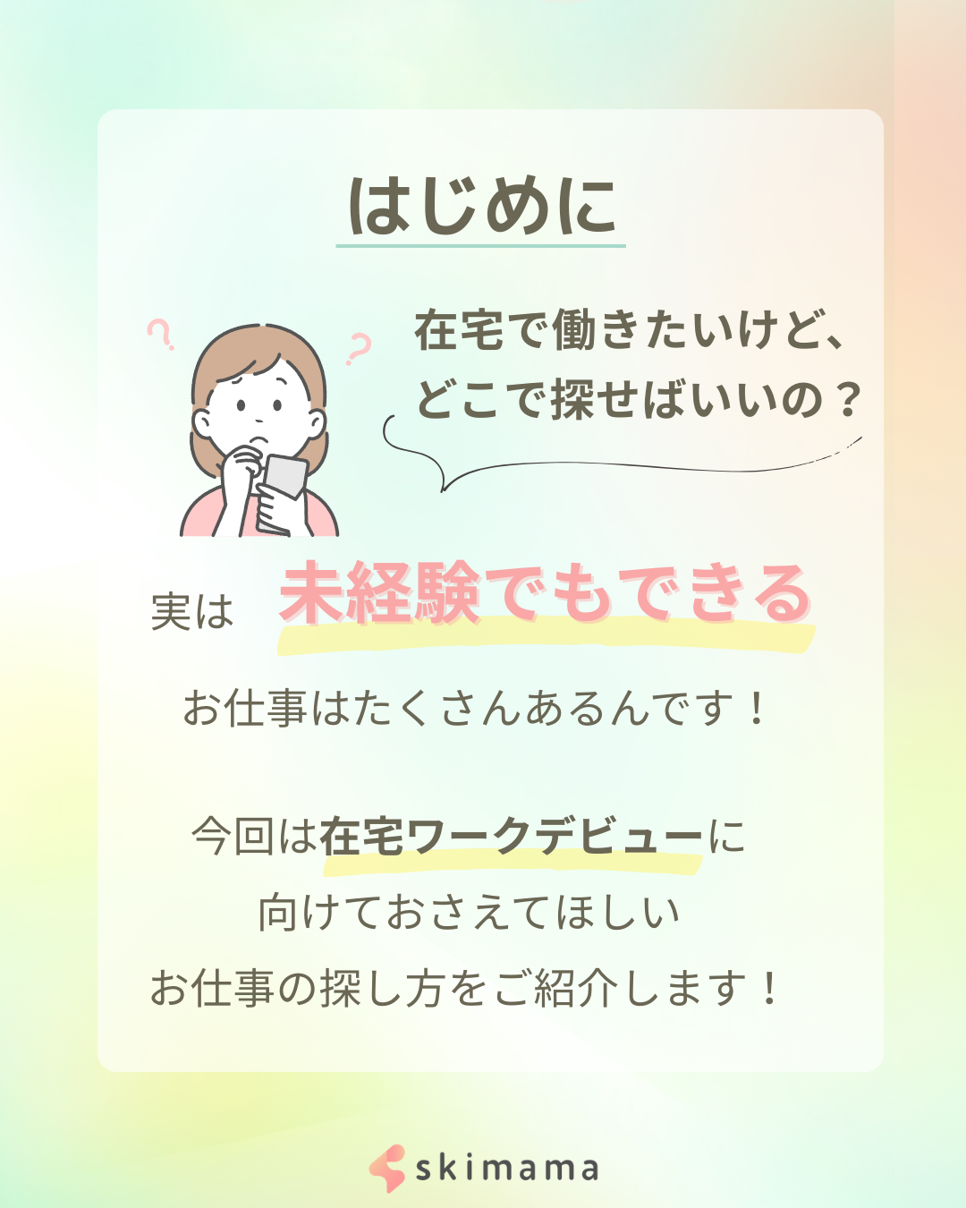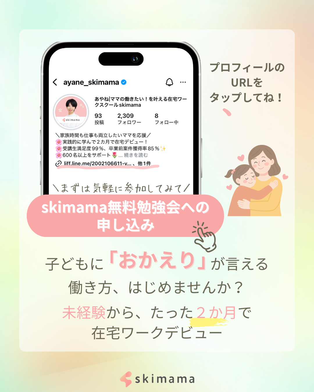 在宅ワークに挑戦できるサービスを想定し、Skimama課題としてInstagramフィード投稿を制作しました。ターゲットは子育て中のママ層。安心感と行動喚起につながるデザインを意識しました。