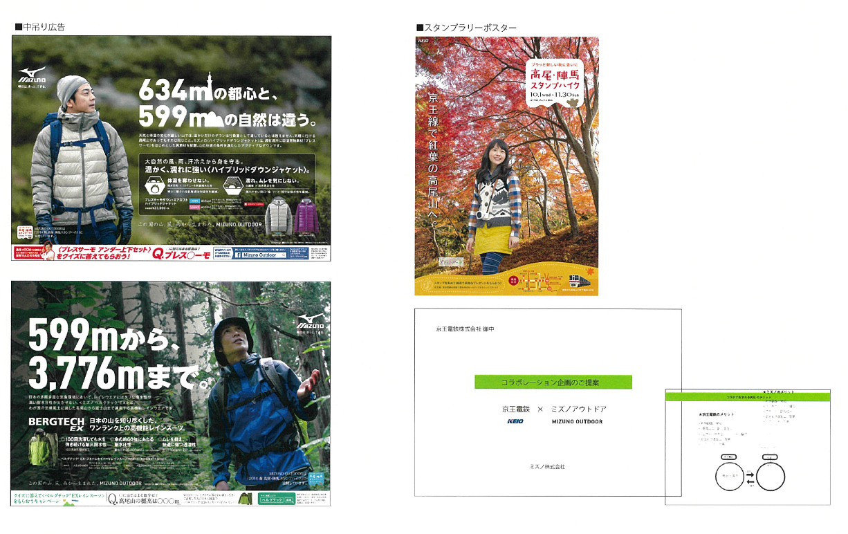 提案。京王線に高尾山ハイカーを意識した(高尾山 599m) ミズノアウトドアの中吊り広告を出稿した他、プラットガールへの衣装提供、スタンプハイクへの協賛を実施。京王側には安全登山の啓蒙などを提供した。