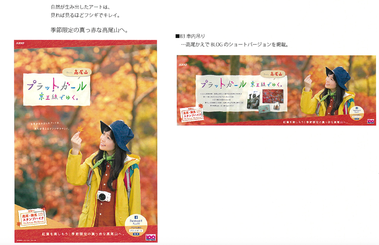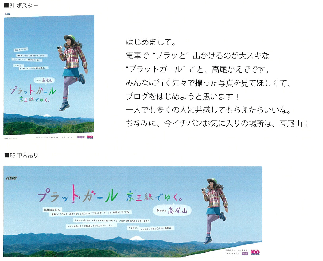 プラットガール「高尾かえで」は、電車で出掛けることと写真を撮ることが好きな「カメラ女子」という設定。撮影した写真数点をブログ(FB)にアップするSNS連動企画とした。2013 年から 2014 年までの 2年間、月間ポスター、TVCM 、高尾かえでの BLOGなどをトータルで担当。