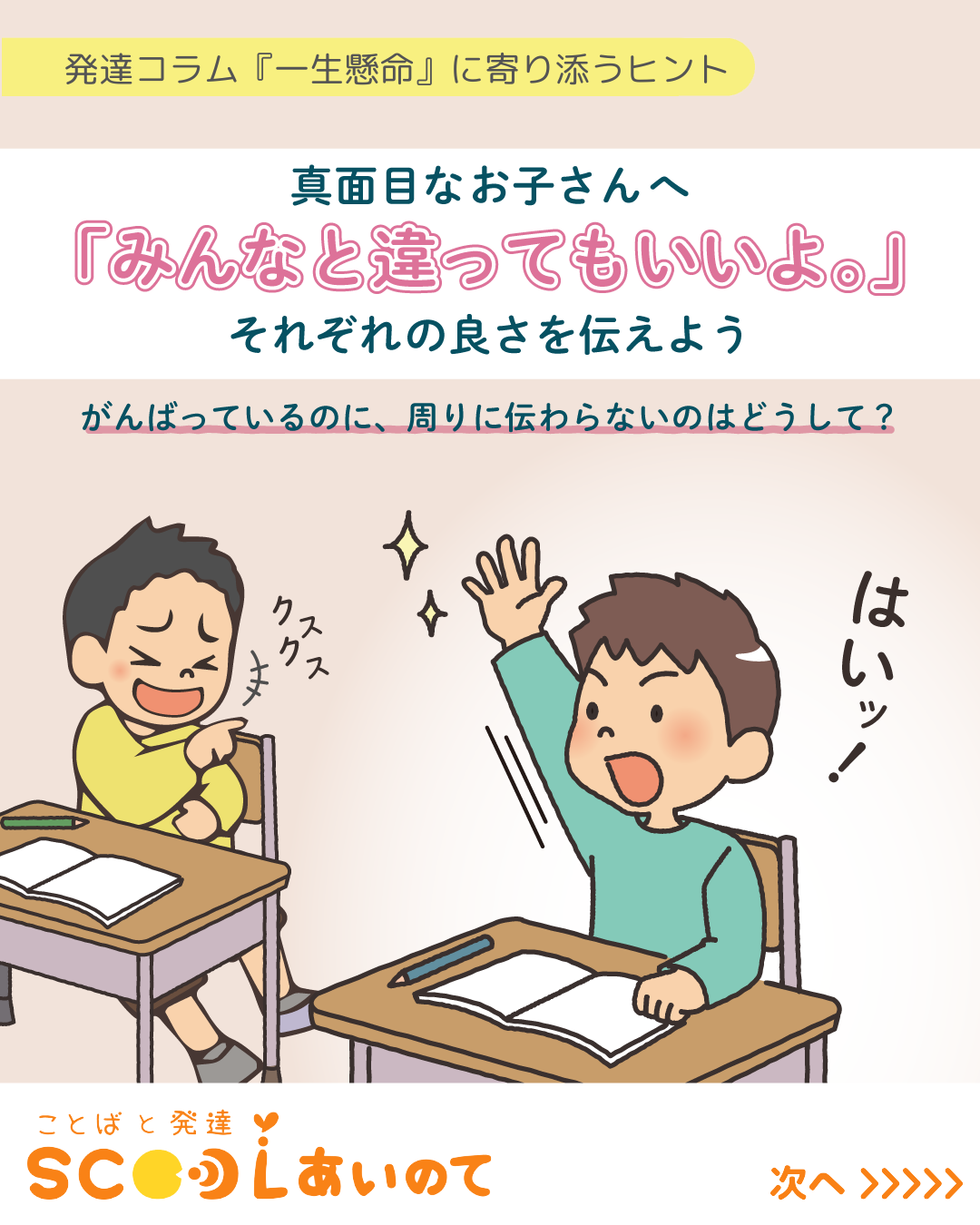 「頑張っているのに、周りに伝わらないのはどうして?」は、親が抱いている気持ちでもあり、子供が抱いている気持ちでもあるので、吹き出しは使用していません。