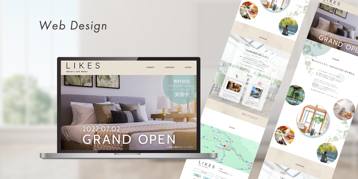 SHElikesの課題で制作した、リゾートホテルLIKESのオープンキャンペーンサイト(架空案件)のデザインカンプです。