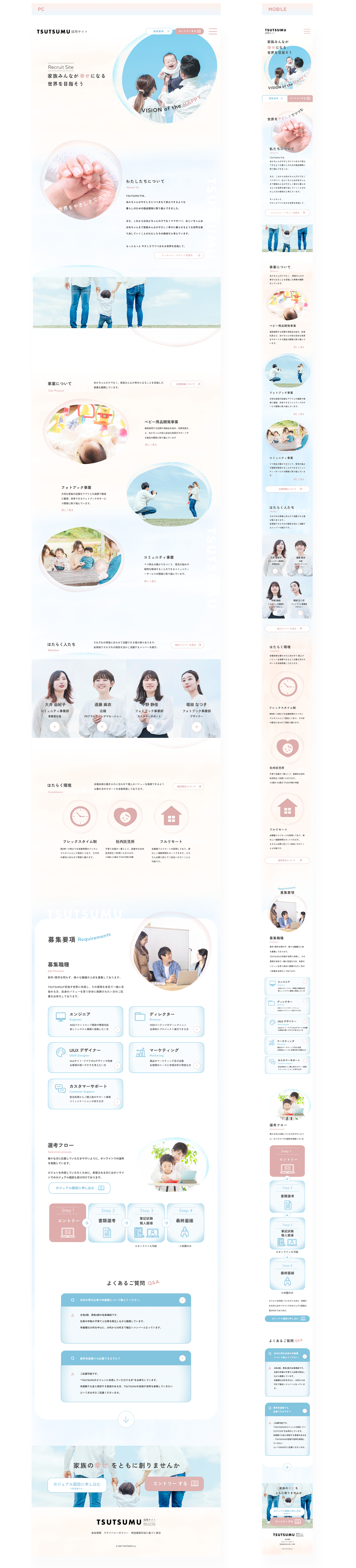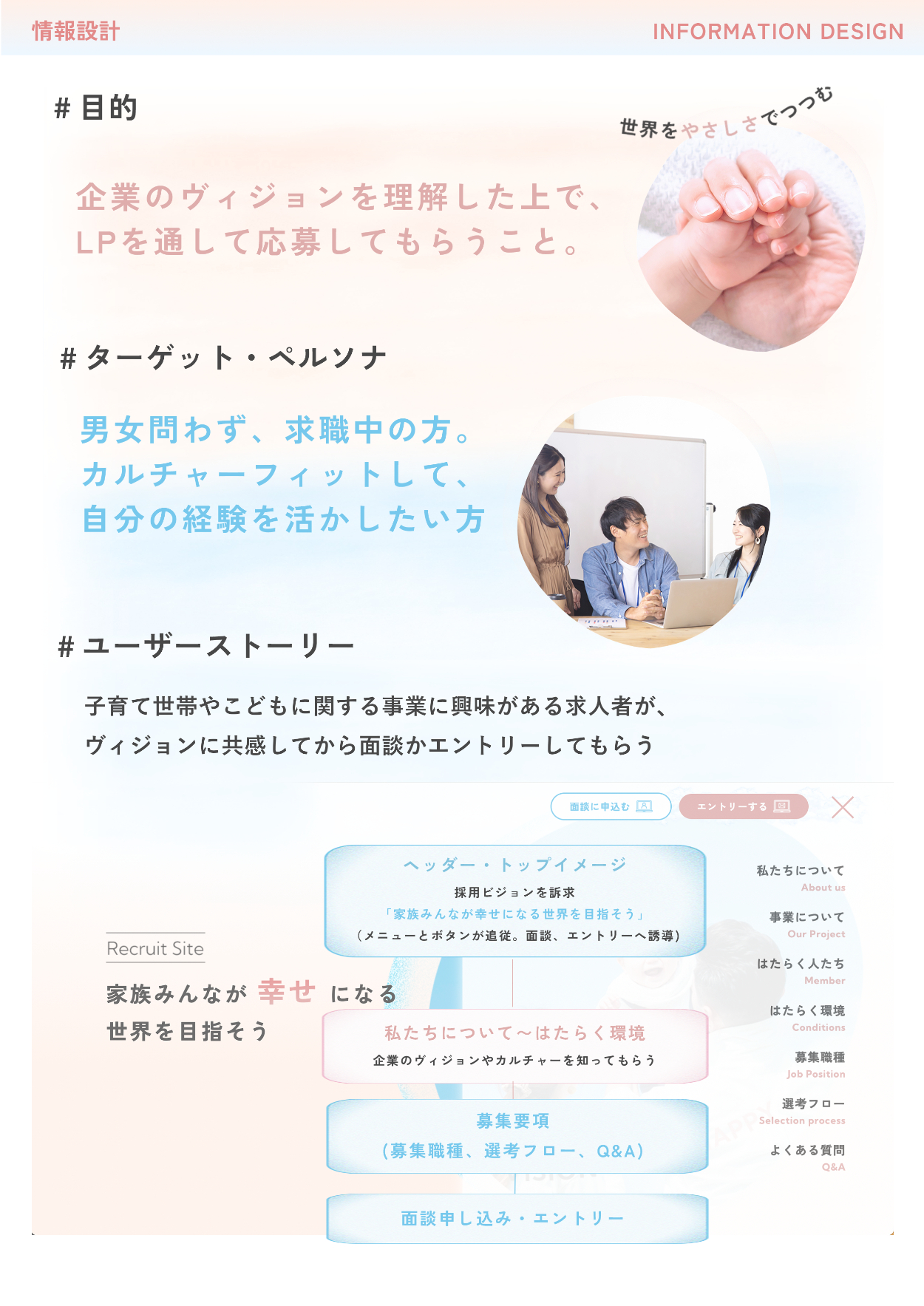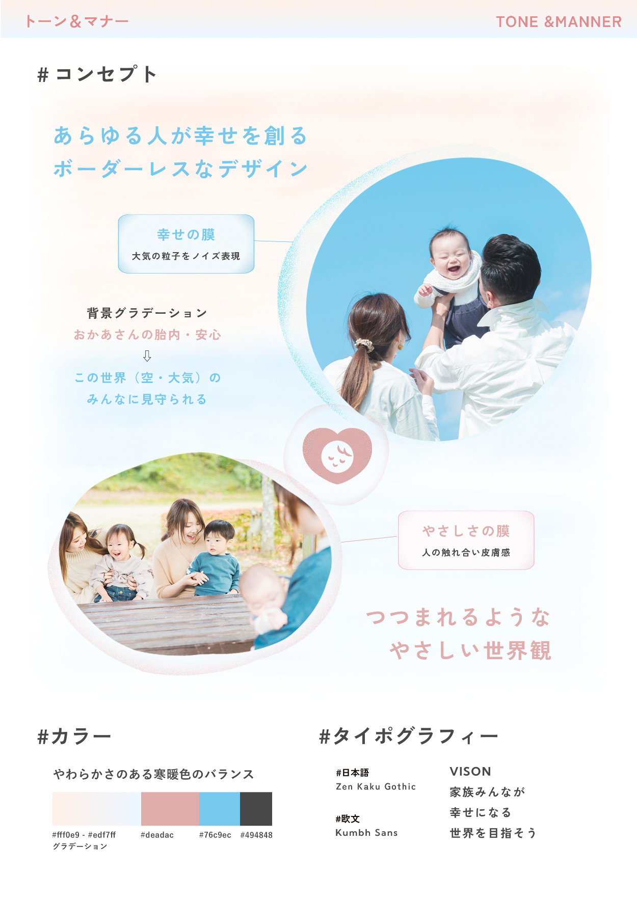 - 企業のベビー事業に対するヴィジョンは必ず伝わるように、あかちゃんと幸せな家族のイメージを使用しながら、子供がやさしさにつつまれて成長する。