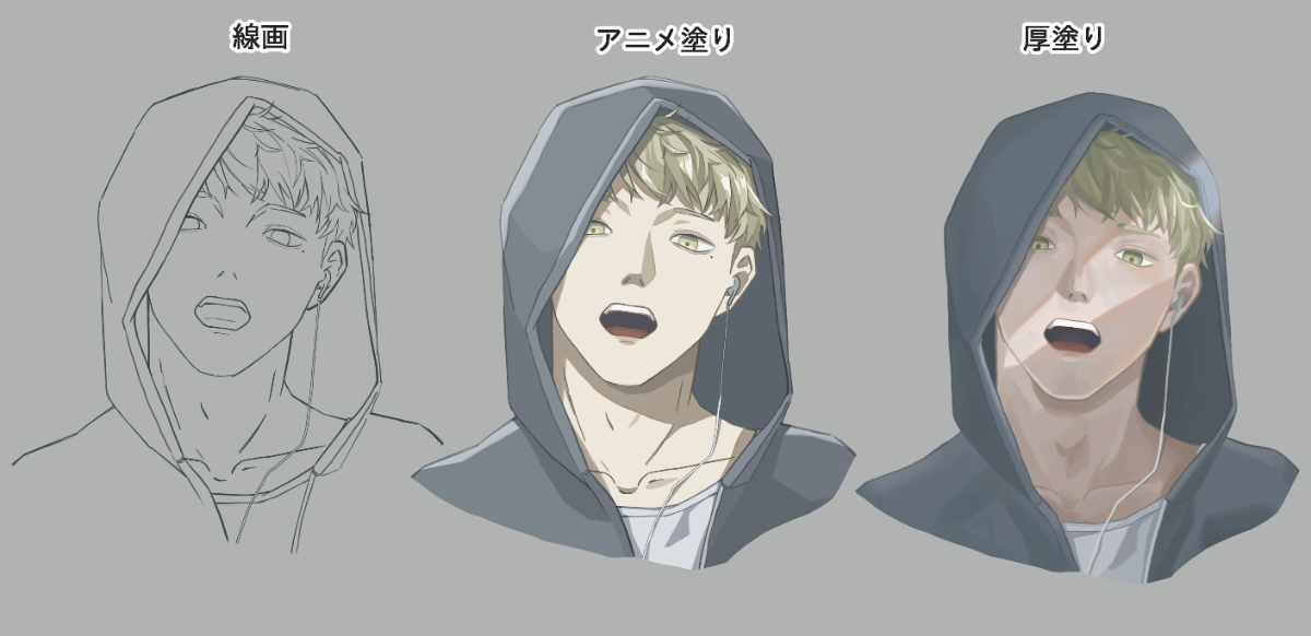 この課題では、オリジナルのキャラクターを創作し、アニメ塗り、厚塗りと塗分けをしました。キャラクターのコンセプトは、少し気怠げな雰囲気のかっこいい男の子です。暗い雰囲気を出すために、色は彩度が低めのものでまとめました。