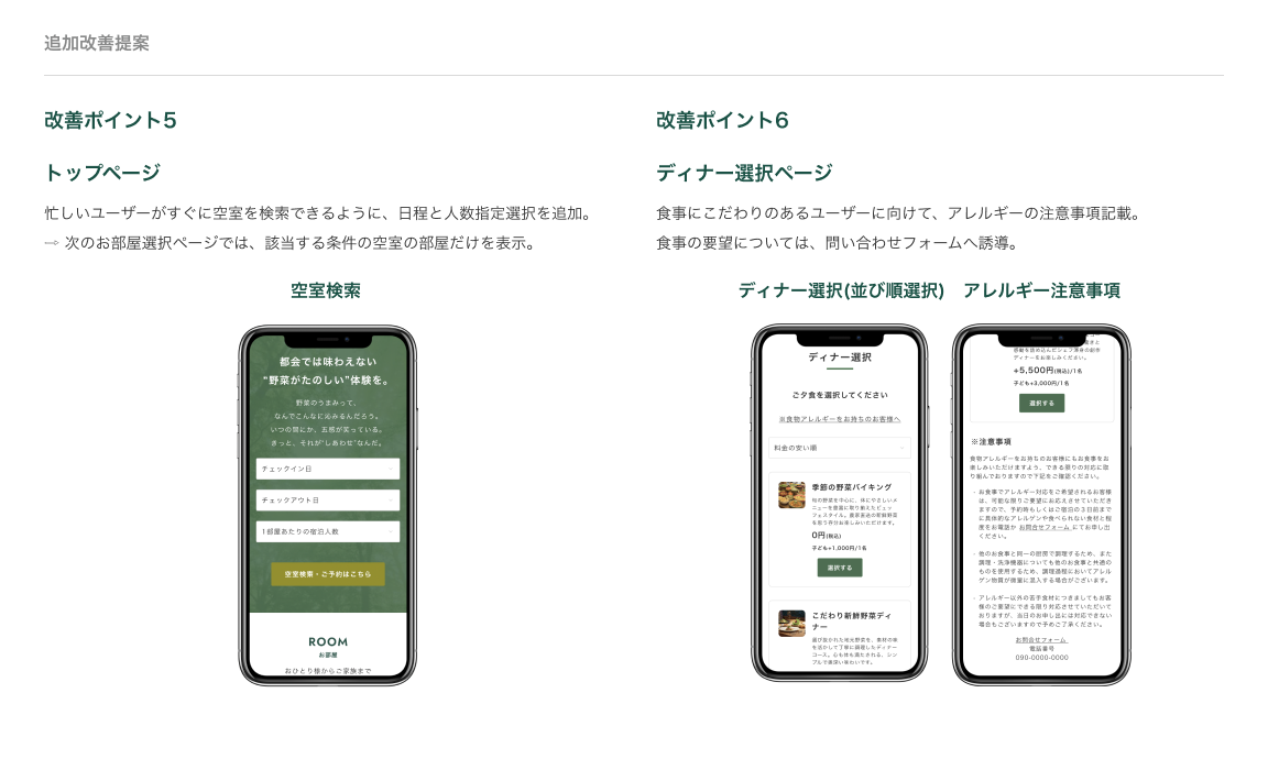 指定の改善ページ以外にもトップページの空室検索設置や、ディナー選択ページでの食品アレルギーの注意事項表記など、ターゲットのペルソナを意識した改善案を追加。