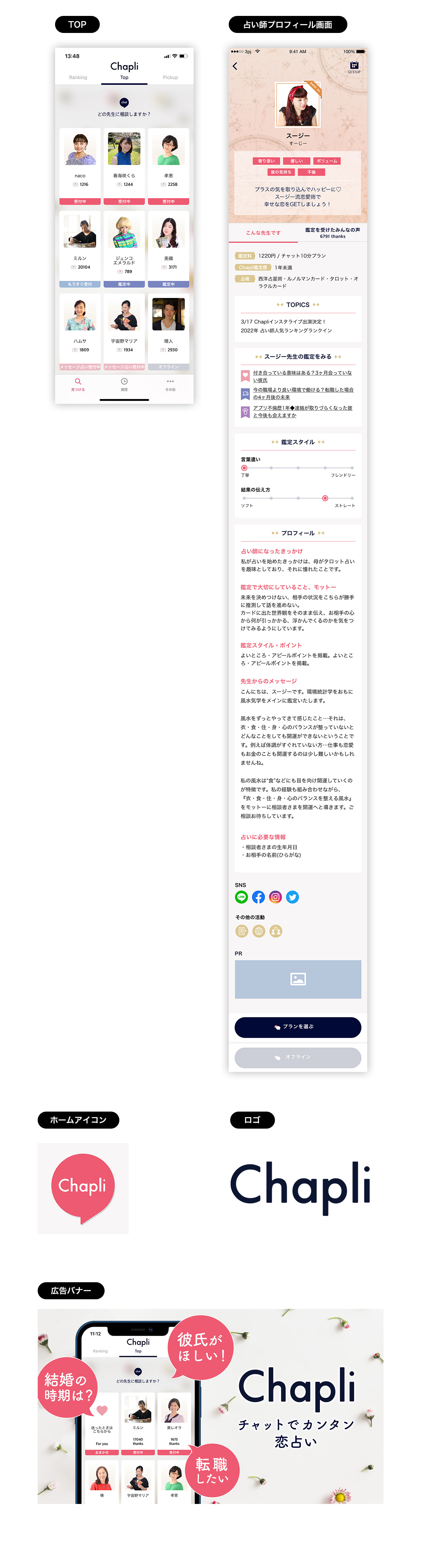 本格的な占いを気軽にチャット形式で体験できる占いアプリ「Chapli」のUI/UXデザインを担当しました。ロゴを含め全ての制作部を担当しております。