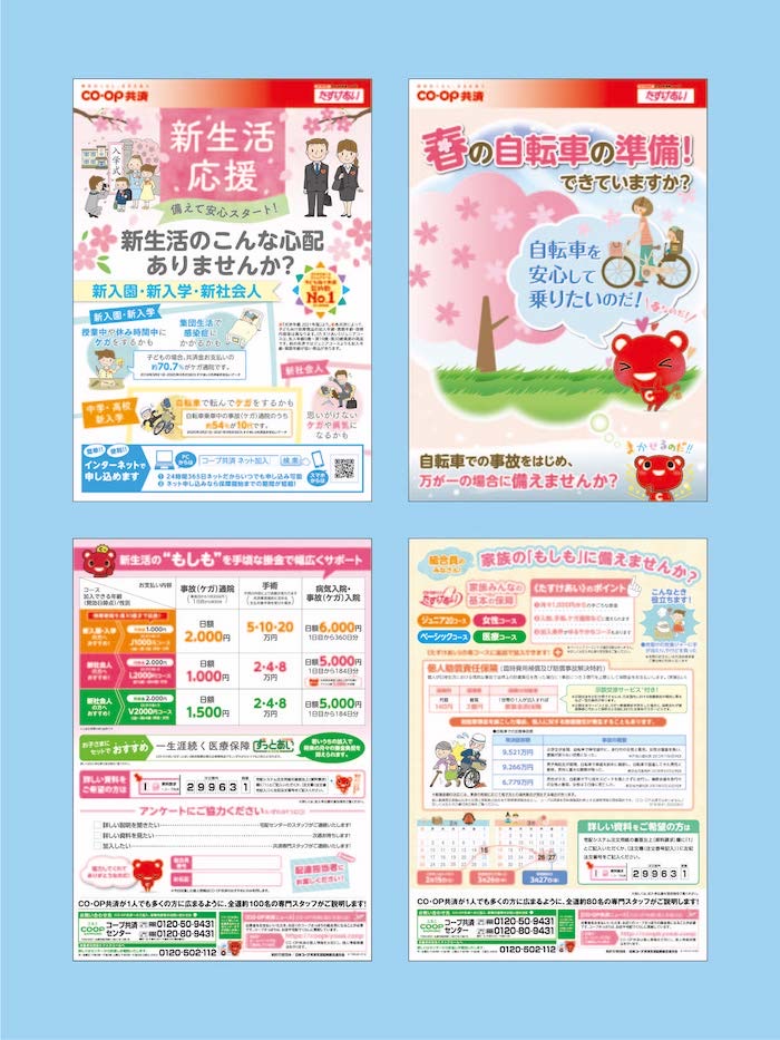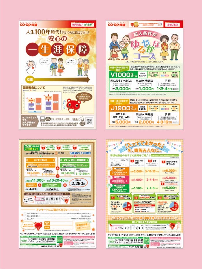 コープ共済様 チラシ イトウユカ グラフィックデザイナー OVERVIEW コープ様の宅配商品をご利用のお客様にお届けしている、保険をおすすめするチラシの製作を複数担当しておりました。コープ様御担当者様と直接やり取りし、打ち合わせ~納品まですべての工程に携わりました。