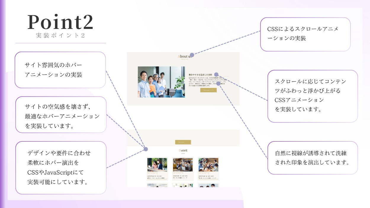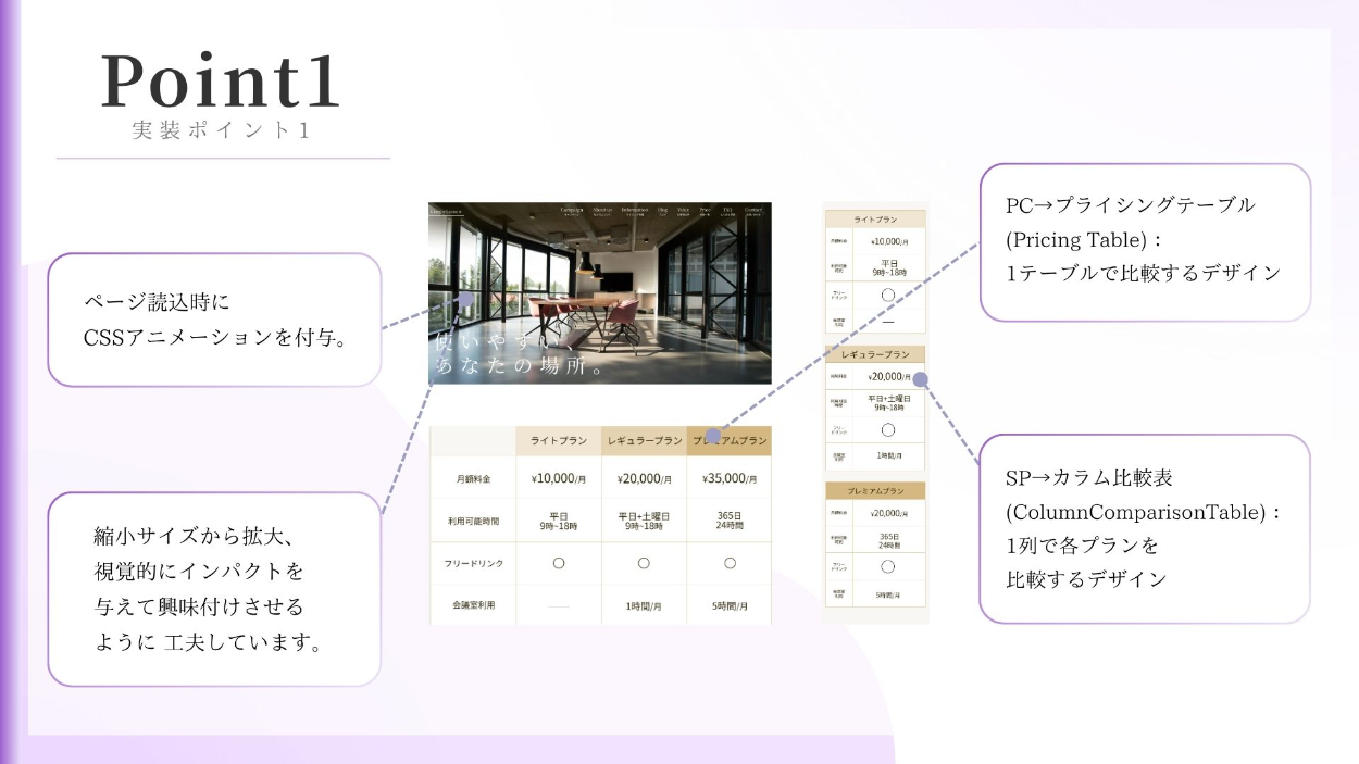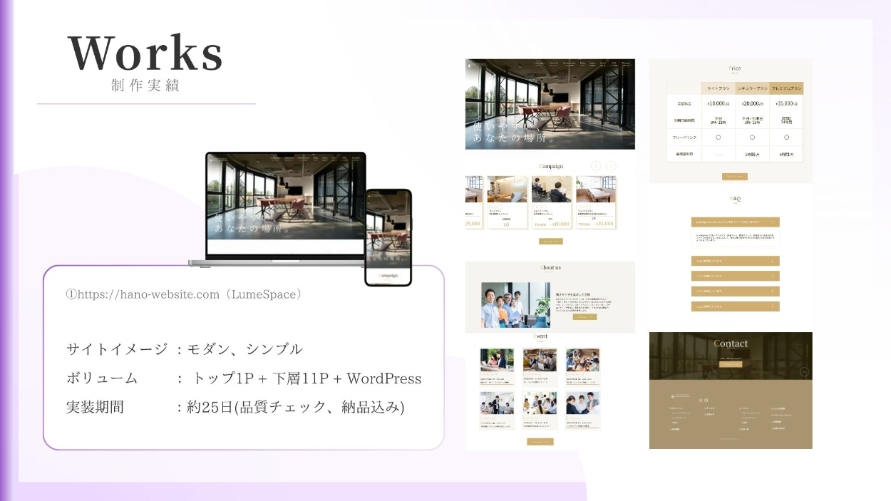 クライアント様のご要望に合わせて、余白をしっかりと確保し、ゆとりあるレイアウトで構成しました。全体として落ち着いた印象を持たせ、情報の見やすさを高めています。