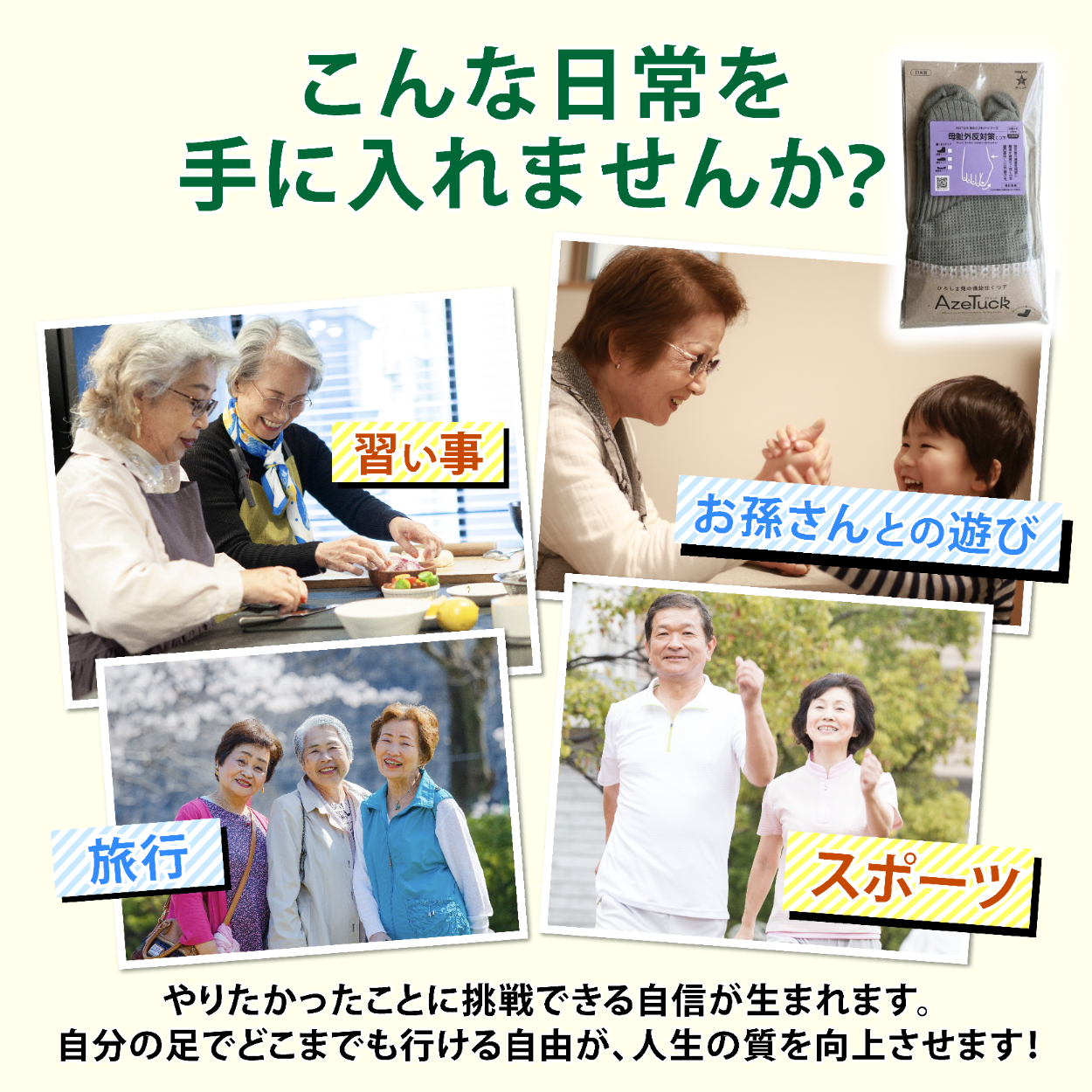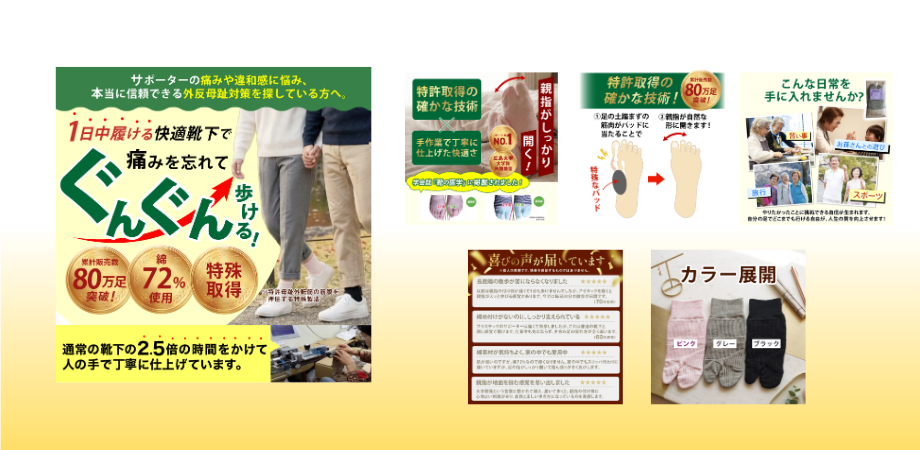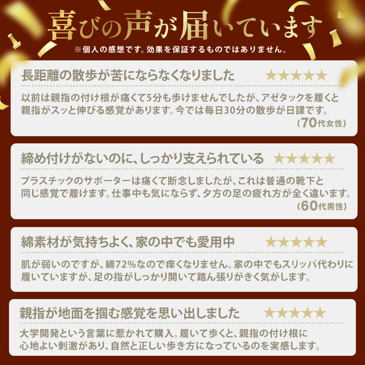 アゼタック(外反母趾対策靴下) ちゃぽデザイン WEBデザイナー OVERVIEW Amazonカタログ作成事例。2026年3月〜配信予定。特許取得の技術を活かした機能性靴下で、商品画像作成によって、商品特徴やこだわり・機能性を伝えられる構成を意識して作成しています。