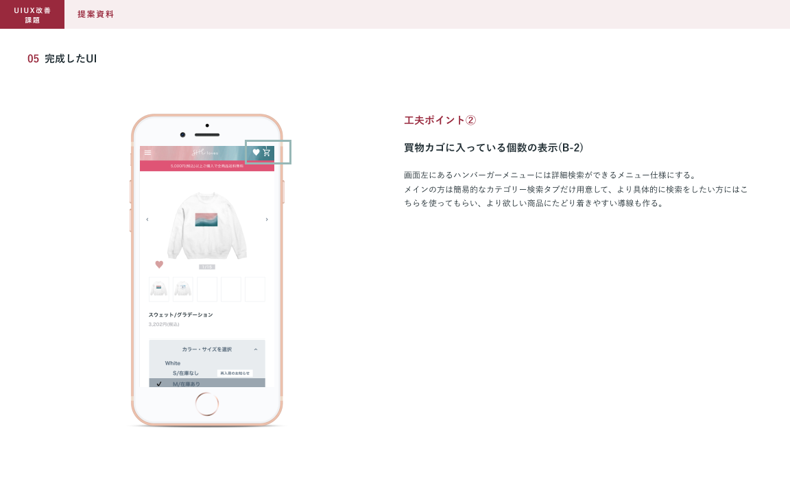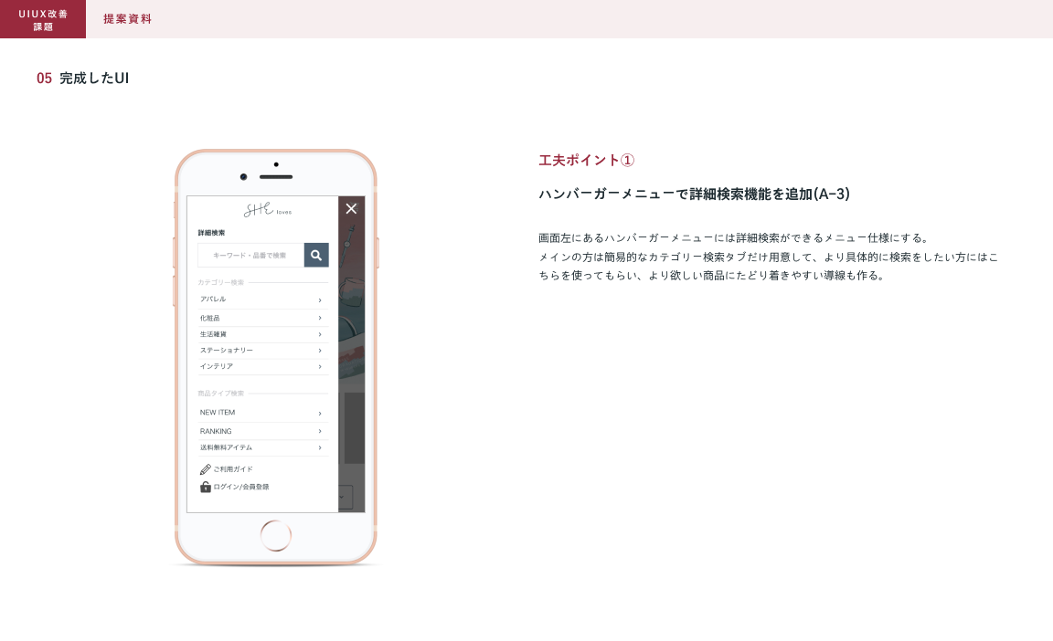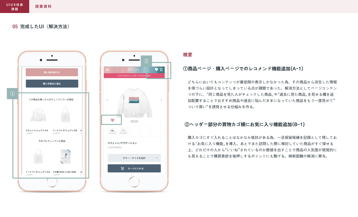 2. 具体提案の盛り込み(カテゴリーのタブ導入提案ではタブを開いた時のイメージや特集バナー導入ではどんな特集を盛り込むべきかといった観点まで提案)