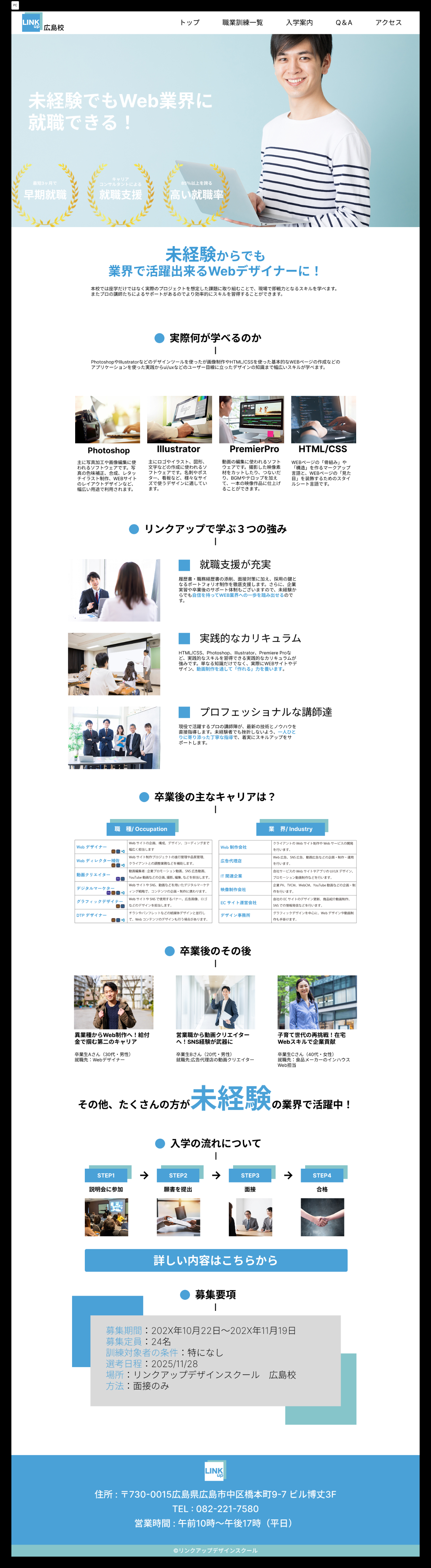 ペルソナを「20代後半の男性」 「業界未経験」に設定し、未経験者が安心して学べる印象を与える構成とデザインを目指しました。このサイトで重要なのは「未経験でもWeb業界を目指せる」という点なのでワイヤーフレームでは情報の優先順位を明確にし、スクロールの流れを意識。配色は信頼感と清潔感を意識して、青系と白ベースで統一し教育系サイトらしい誠実さを表現しました。