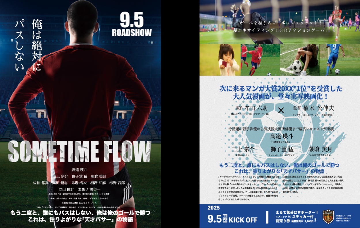 「孤高の天才パサーの葛藤と覚醒」をテーマに、緊張感と力強さを感じるサッカー映画の世界観をビジュアルで表現しました。「俺は絶対にパスしない」というサッカーではありえないキャッチコピーにすることで興味関心を引く意図があり、デザインのこだわりは人物を目立たせるため表紙部分のフォントは白に統一してシンプルに仕上げた点です。