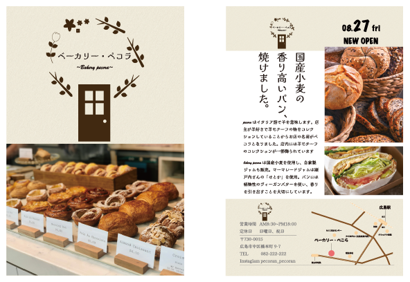 素朴であたたかい印象を与えるデザインを意識し、「通いたくなるパン屋さん」の雰囲気をカード1枚で伝えられるようにしました。こだわった点は手描き風のモチーフ(花や小枝)で、やさしい印象と手づくり感を表現し、フィルター効果でザラっとした紙の質感を再現した点です。