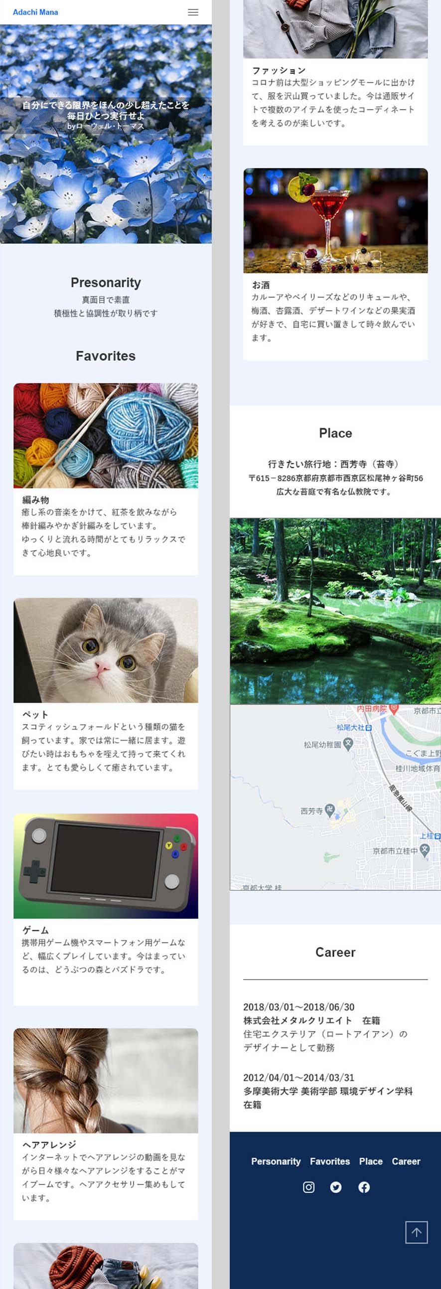 私の人柄である『真面目』『誠実さ』『落ち着き』『慎重さ』『謙虚さ』『思いやり』『信頼感』を表すイメージカラーが青色のため青色をベースに配色を考えました。