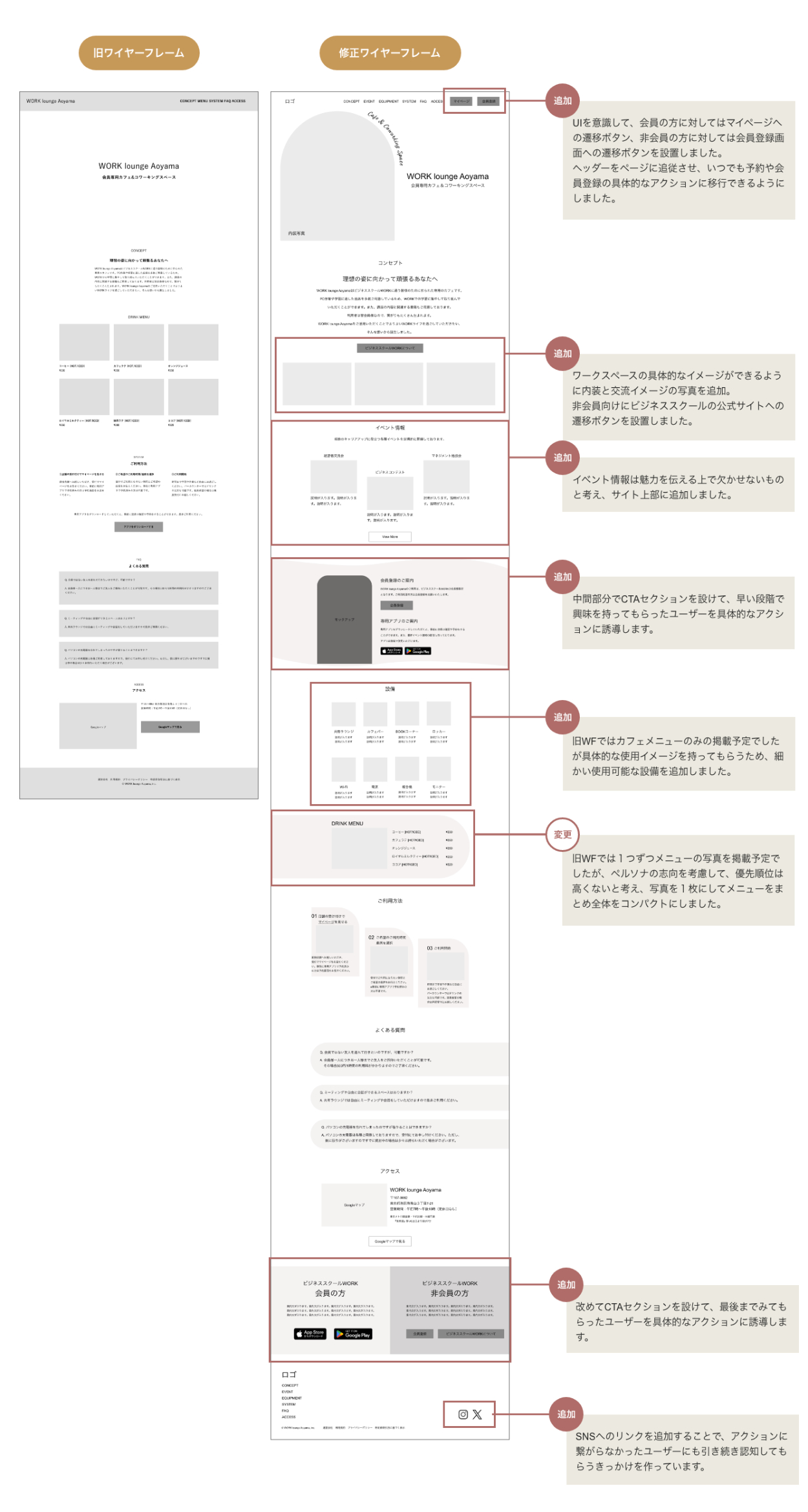 クライアントに提供いただいたワイヤーフレーム案について、ペルソナの思考、ユーザーストーリーを考慮して情報の追加、変更等の改善案を作成しました。