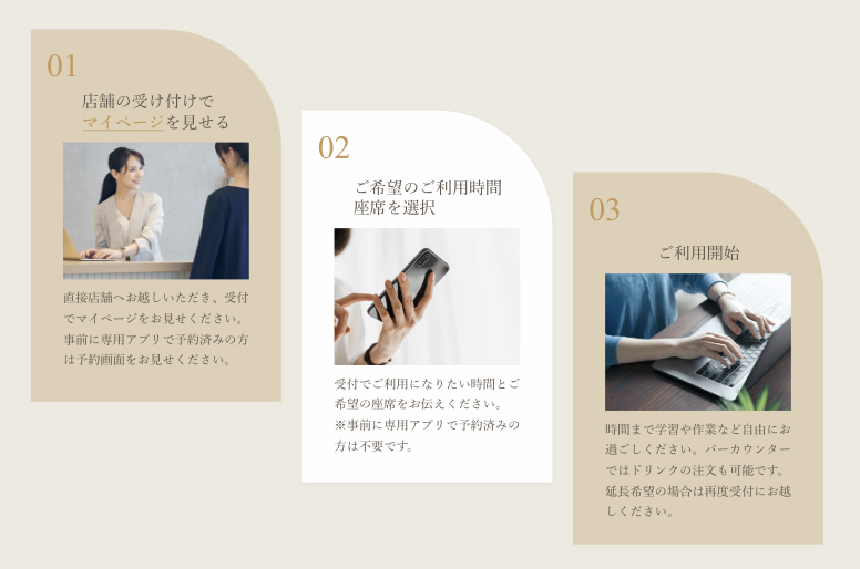 利用方法の手順を斜めに下がるように配置することで、矢印などを使わずに、ビジュアルとしても利用の流れ、順番がわかりやすくなるように工夫しました。