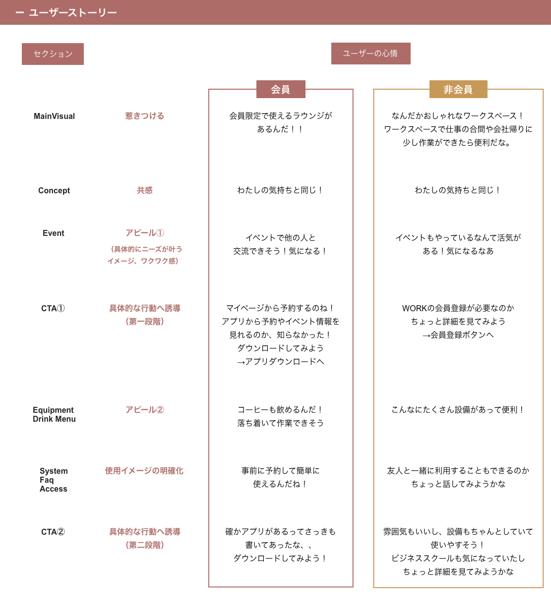 会員と非会員ぞれぞれの今後の動線を色分けして左右に配置することで、ユーザーの次に取る行動がわかりやすくなるように工夫しました。