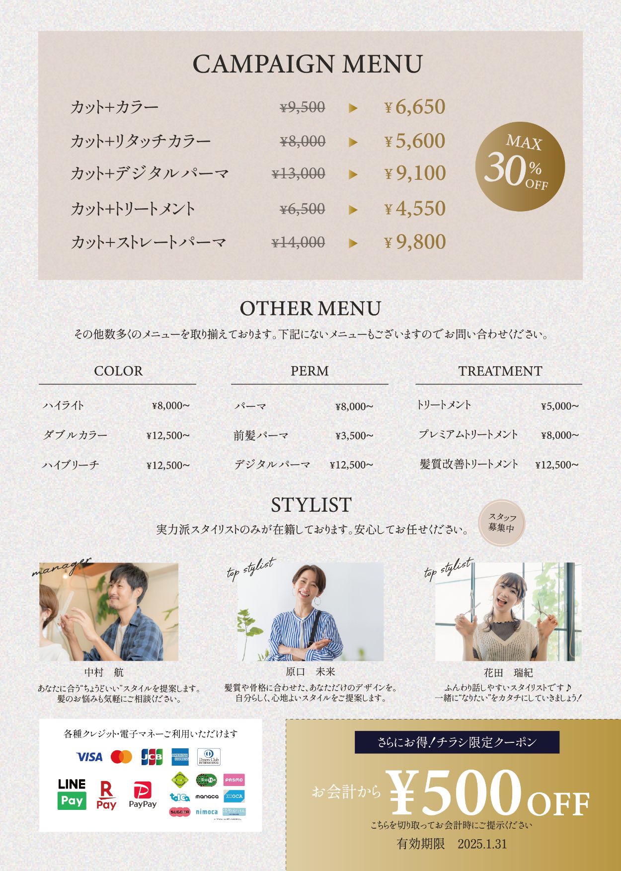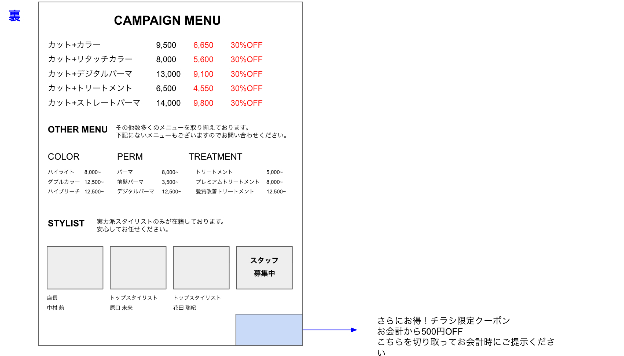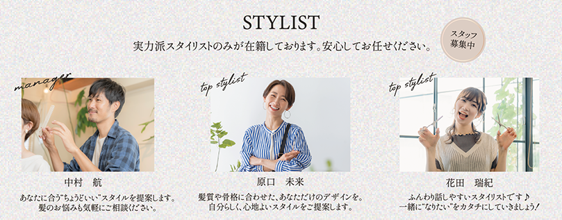 スタイリスト紹介の部分では、写真だけでなくスタイリスト本人のメッセージも添えることで、親しみやすさや信頼感が伝わるようにしました。「この人にお願いしてみたいな」と思ってもらい、安心感を与えています。