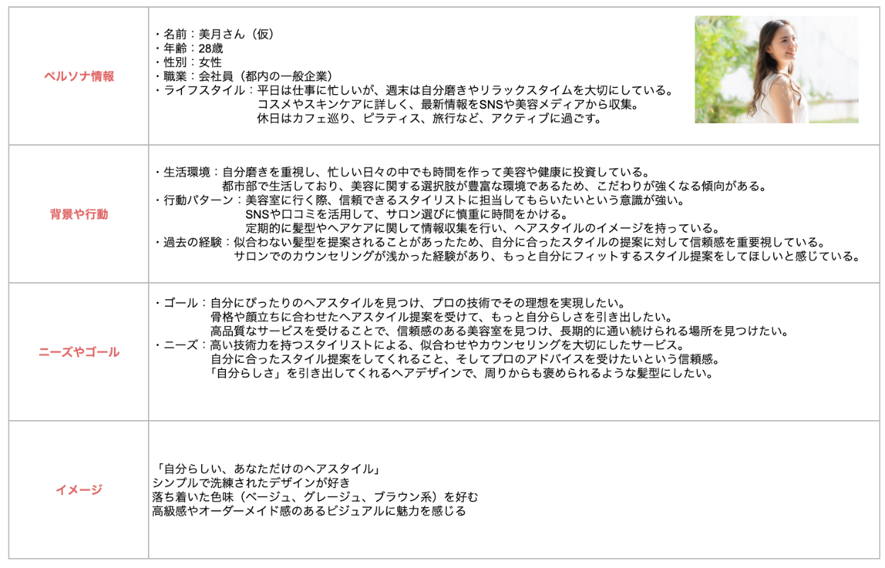 ペルソナの“自分に似合うスタイルを見つけたい”という想いに応え、オーダーメイド感や丁寧な対応を連想してもらえるようにキャッチコピーを付け加えさせていただきました。