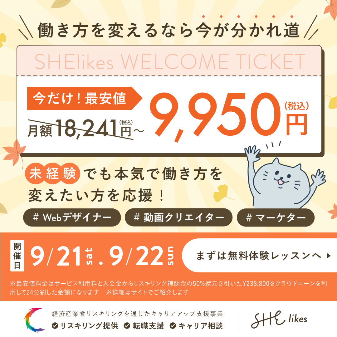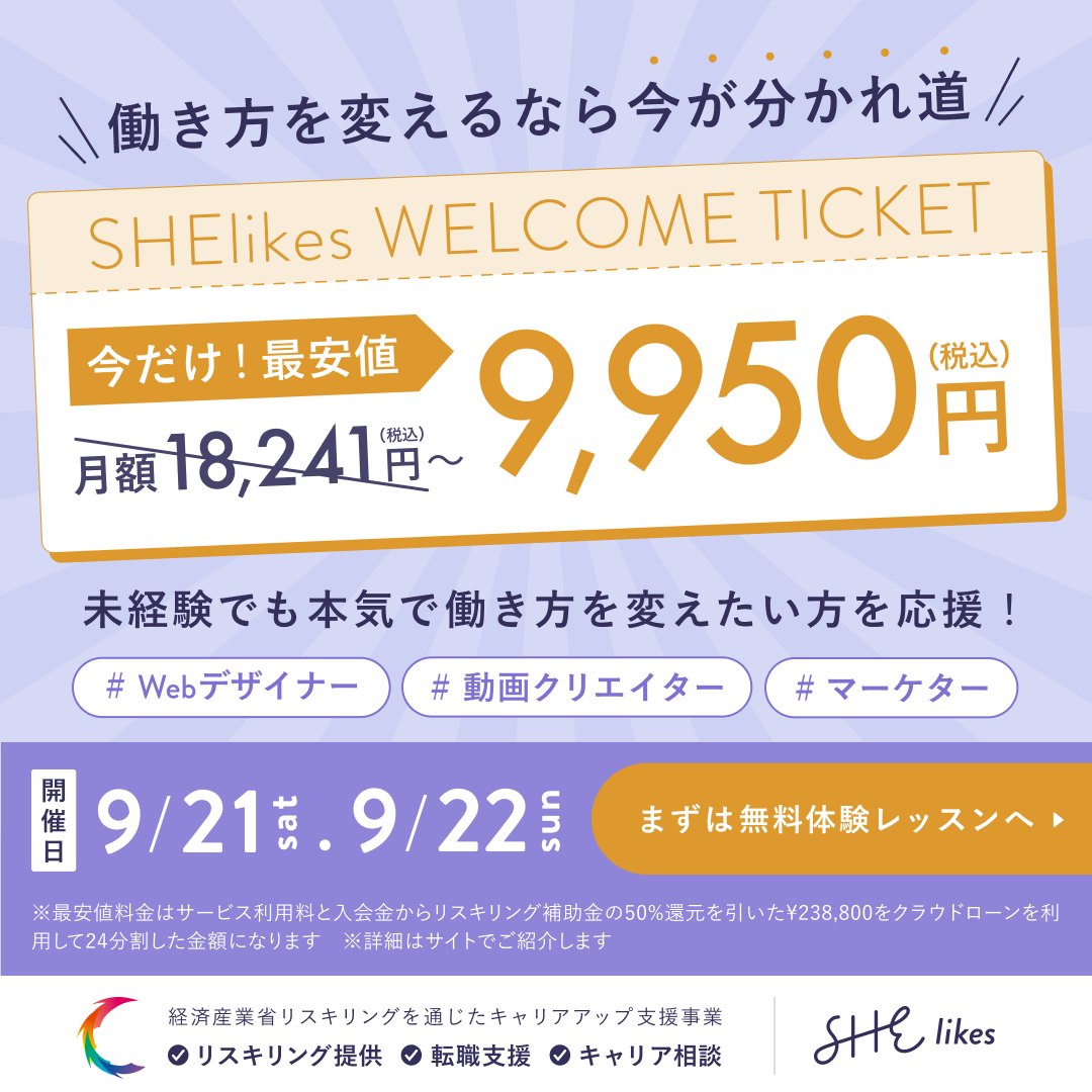 SHE株式会社様が運営する女性向けキャリアスクール「SHElikes」体験レッスンへの誘導を目的としたSNS広告バナーを制作しました。 使用ツール:Figma/制作時期:2024年9月
