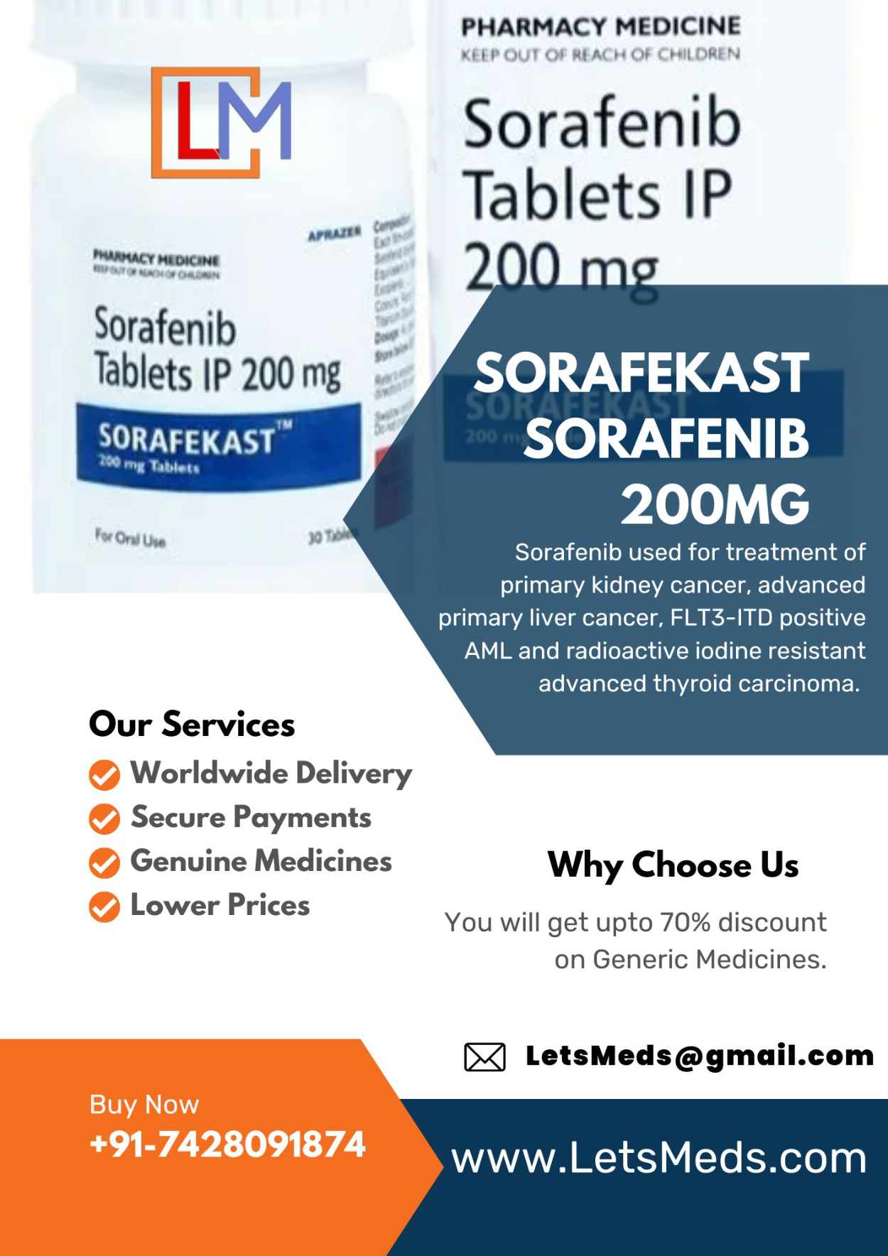 #Sorafenib Tablets Brands online available at LetsMeds Pharmacy at discounted prices. #Sorafenib Brands Online prevents development and multiplication of cancer cells. We Promise to offer the best deal. Over 220 nations, including the United States, United Kingdom, United Arab Emirates, China, Thailand, Malaysia, Singapore, Iran, Italy, Australia, France, Chile, Peru, Brazil, Cambodia, Venezuela, Vietnam, Ecuador, South Korea, South Africa, Nigeria, Hong Kong, Russia, Japan, and the Pilipinas tulad ng Quezon City, Manila, among others, can purchase Indian Sorafenib Brands. Visit LetsMeds or send us an call +91-7428091874 for additional details.