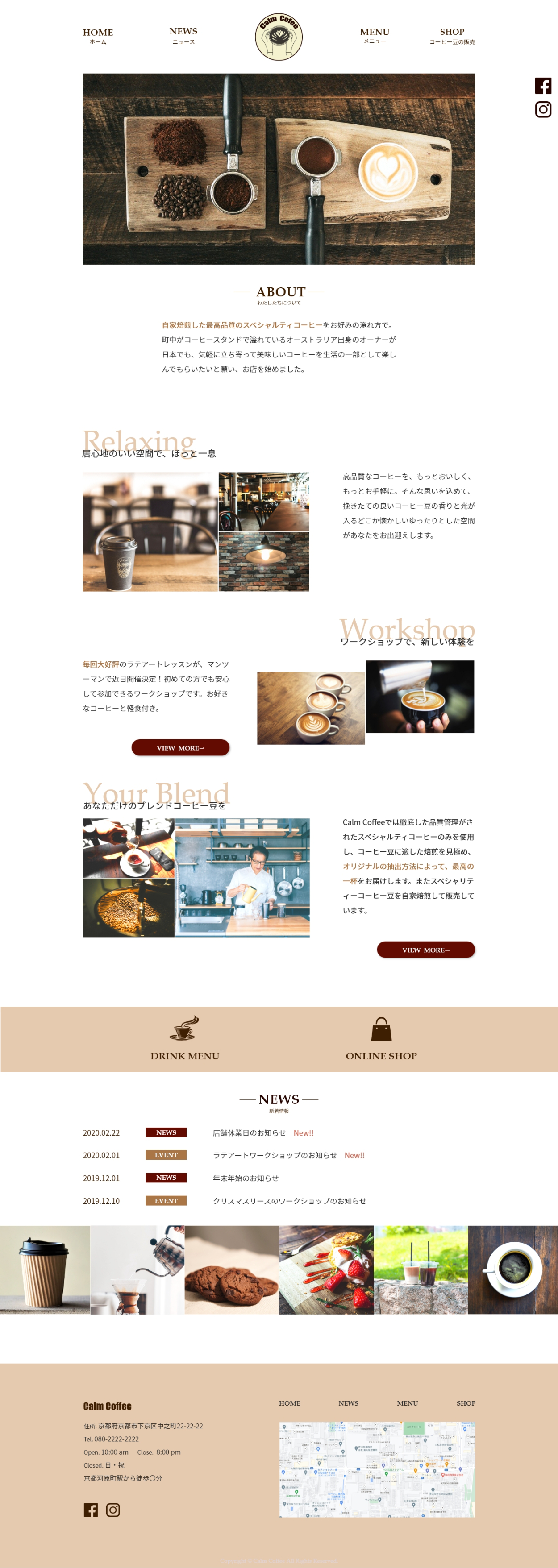 白ベースでシンプルな分かりやすさ重視とのご希望でしたので、配色や装飾を絞り込みました。ボタンやセクションタイトルにはコーヒーをイメージした茶色を使用しております。