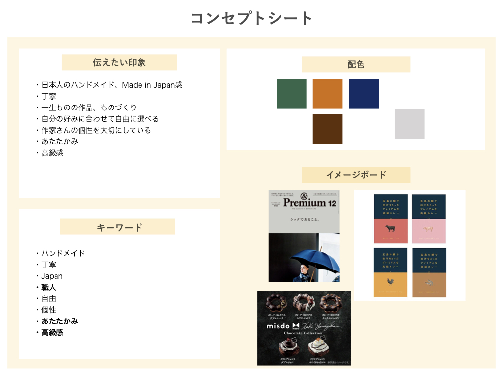 チーム内でサイトへの共通のゴールイメージを持てるよう、制作の最初の段階でコンセプトシートを作成しました。