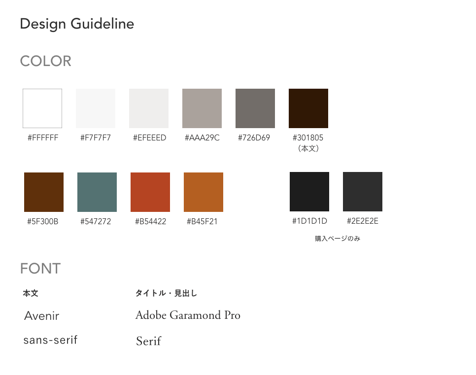 今回のサイトでは、「職人感」「あたたかみ」「高級感」のキーワードから、デザインの方向性を決め、配色に落とし込みました。