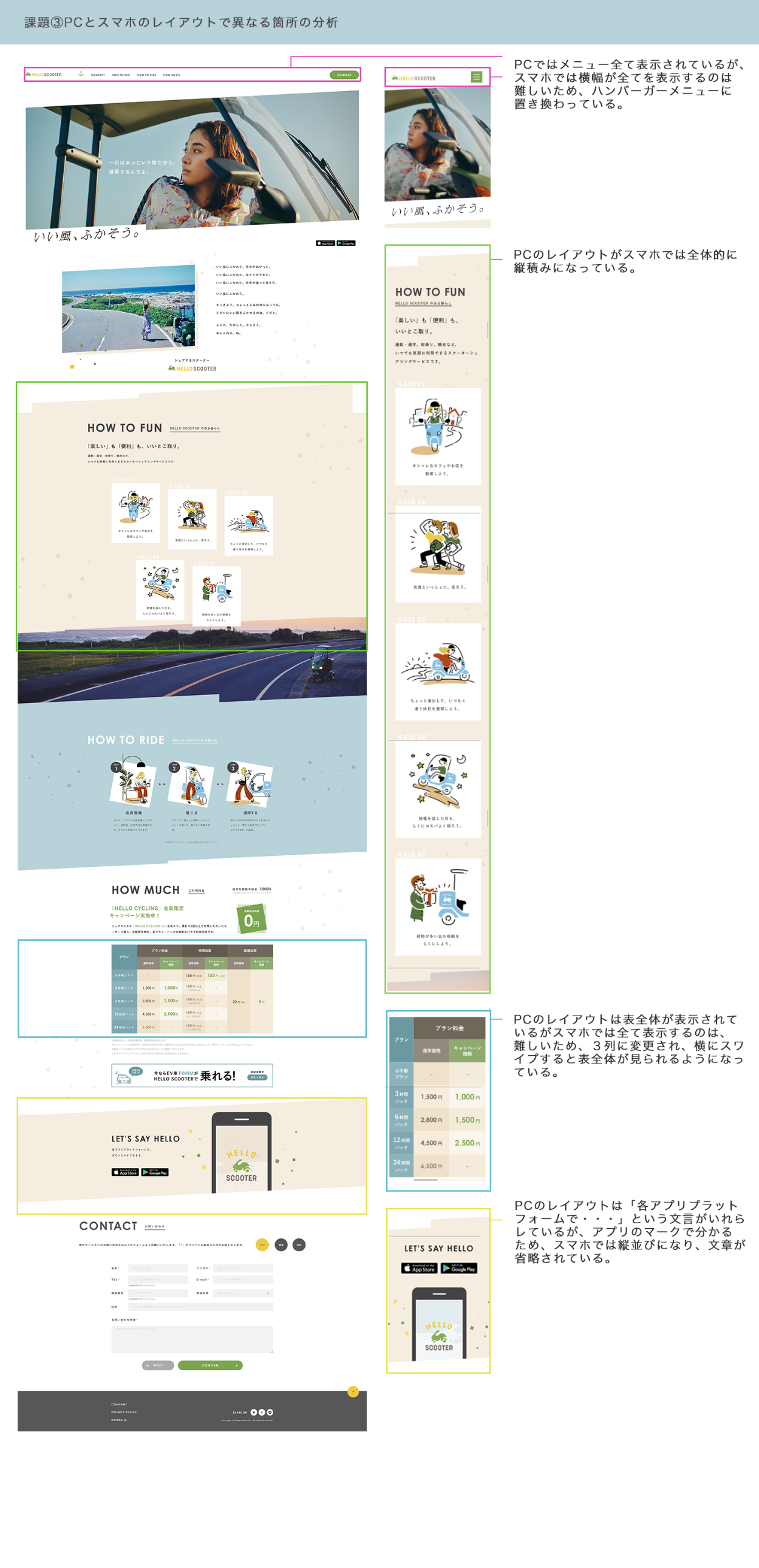 見出しのサイズと説明のフォントサイズに大きく違いをつけることでメリハリが出るということを学びました。また、文字の行間を少し多めにとる事でメッセージ性が強くなるという点も気付きました。このサイトはコンテンツやコンテンツの背景を斜めに入れるデザインが使われており、そうすることでサイト自体に動き出ると感じたため、今後のサイト制作に生かしたいと思いました。