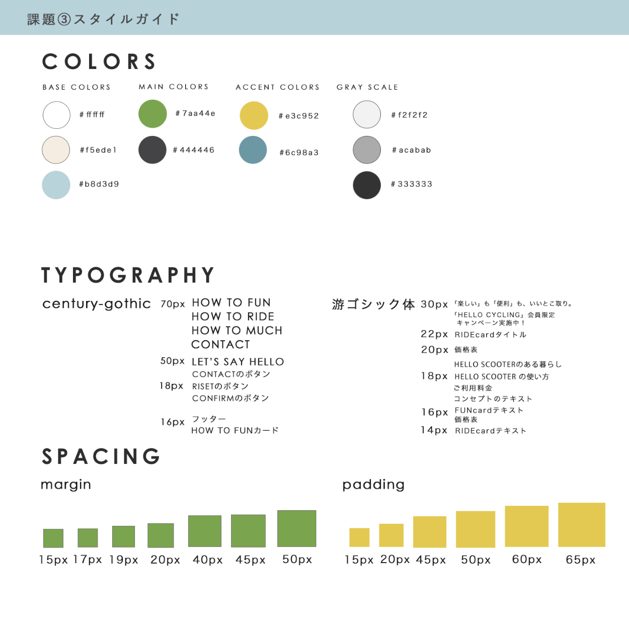 スタイルガイドを作成し、一定のルールに沿ってデザインを作成していく事を学ぶ。