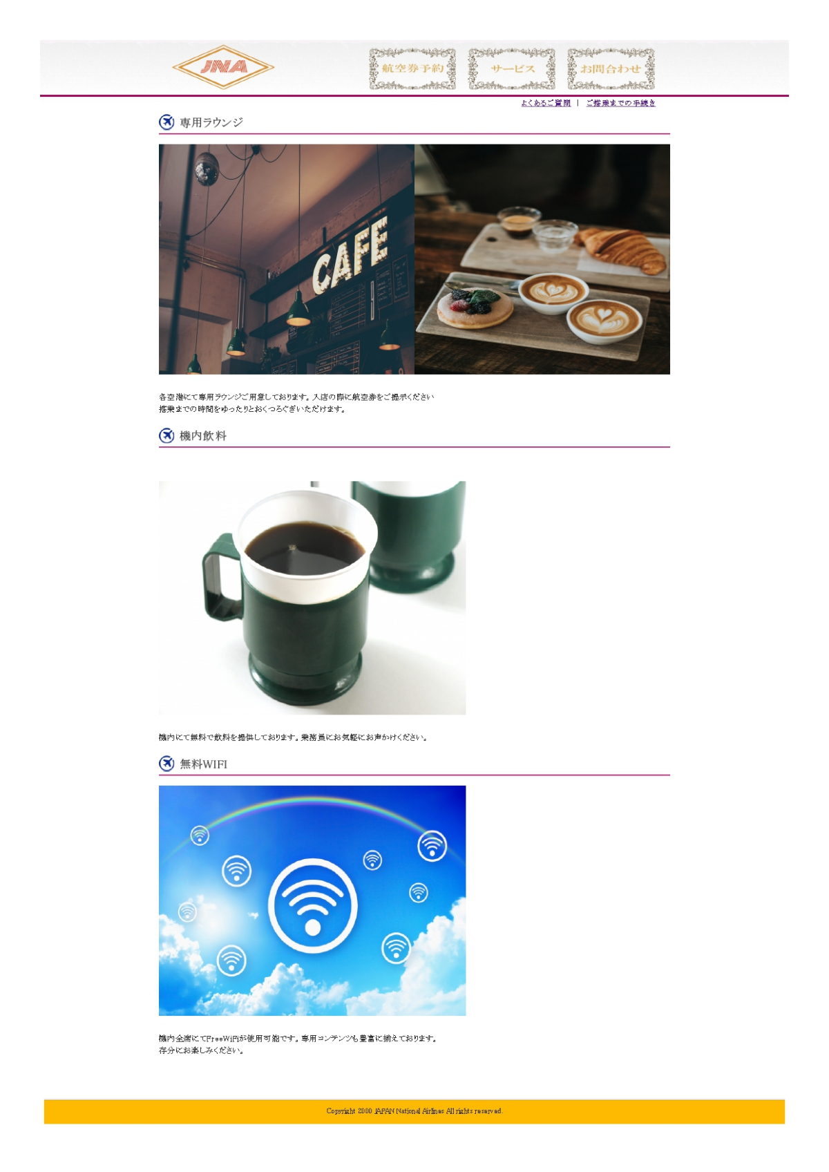 架空航空会社のホームページ Miyazaki Kousuke OVERVIEW 学習が一段落したので製作しました。 高品質な航空会社のページです。 全体的に淡色で仕上げ、ロゴやバナーは極力豪華に見えるようにしました。