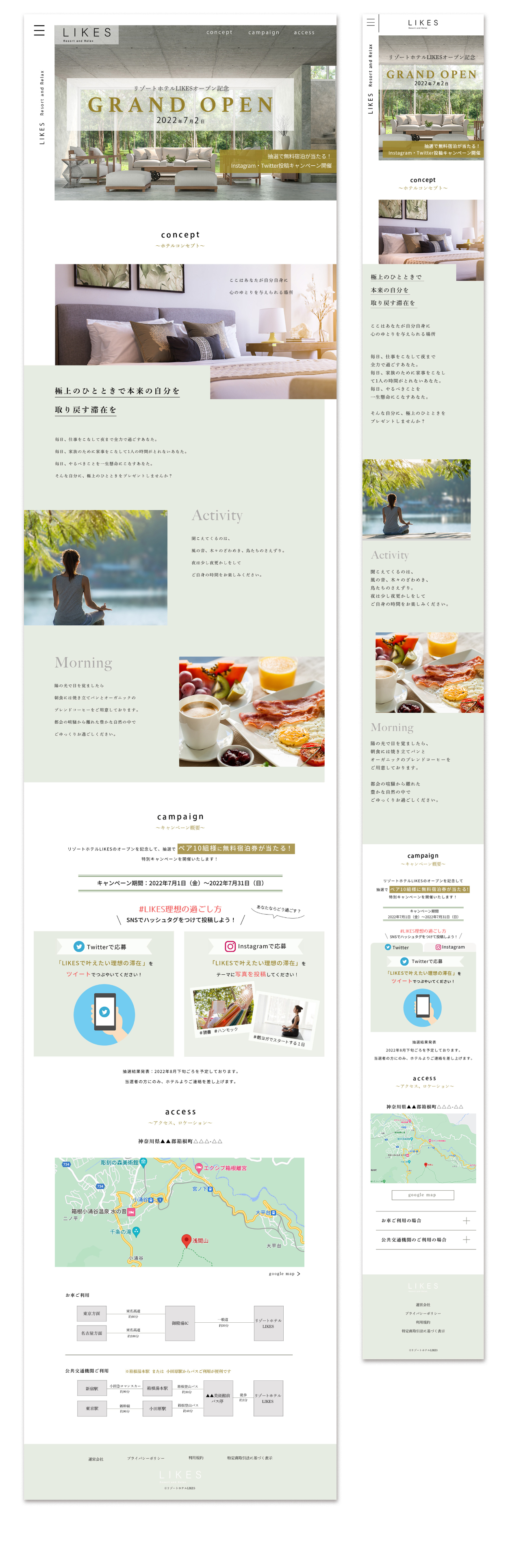 リゾートホテルの運営をしているクライアントより、新しく「リゾートホテルLIKES」をオープンさせるにあたり、宿泊無料キャンペーンを開催したい。ホテルに興味をもってもらい、キャンペーン参加の訴求をするLPデザインをお願いしたいというご依頼。