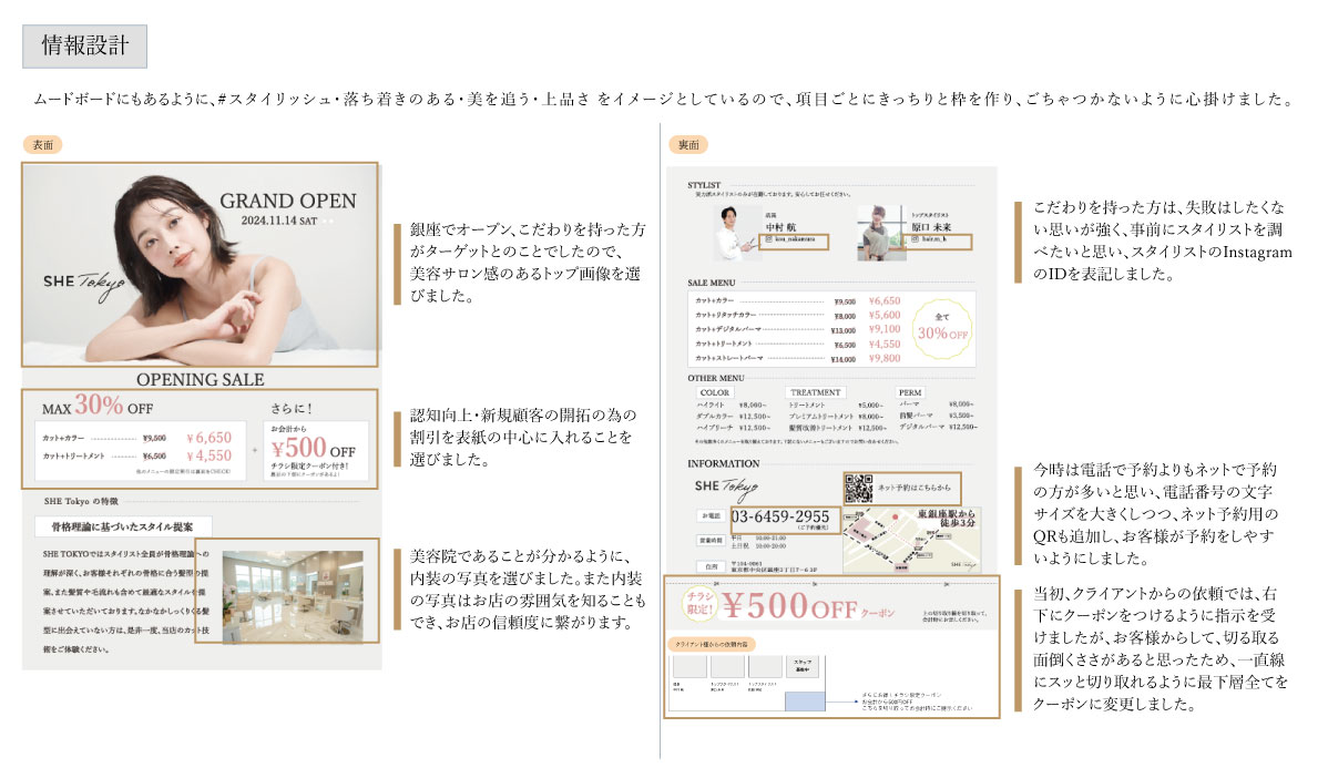 - 与えられた要素を考慮してターゲットを具体的に考えること。新規顧客開拓が目的の一つだったため、紙ベースからSNSやネット誘導することを意識しました。