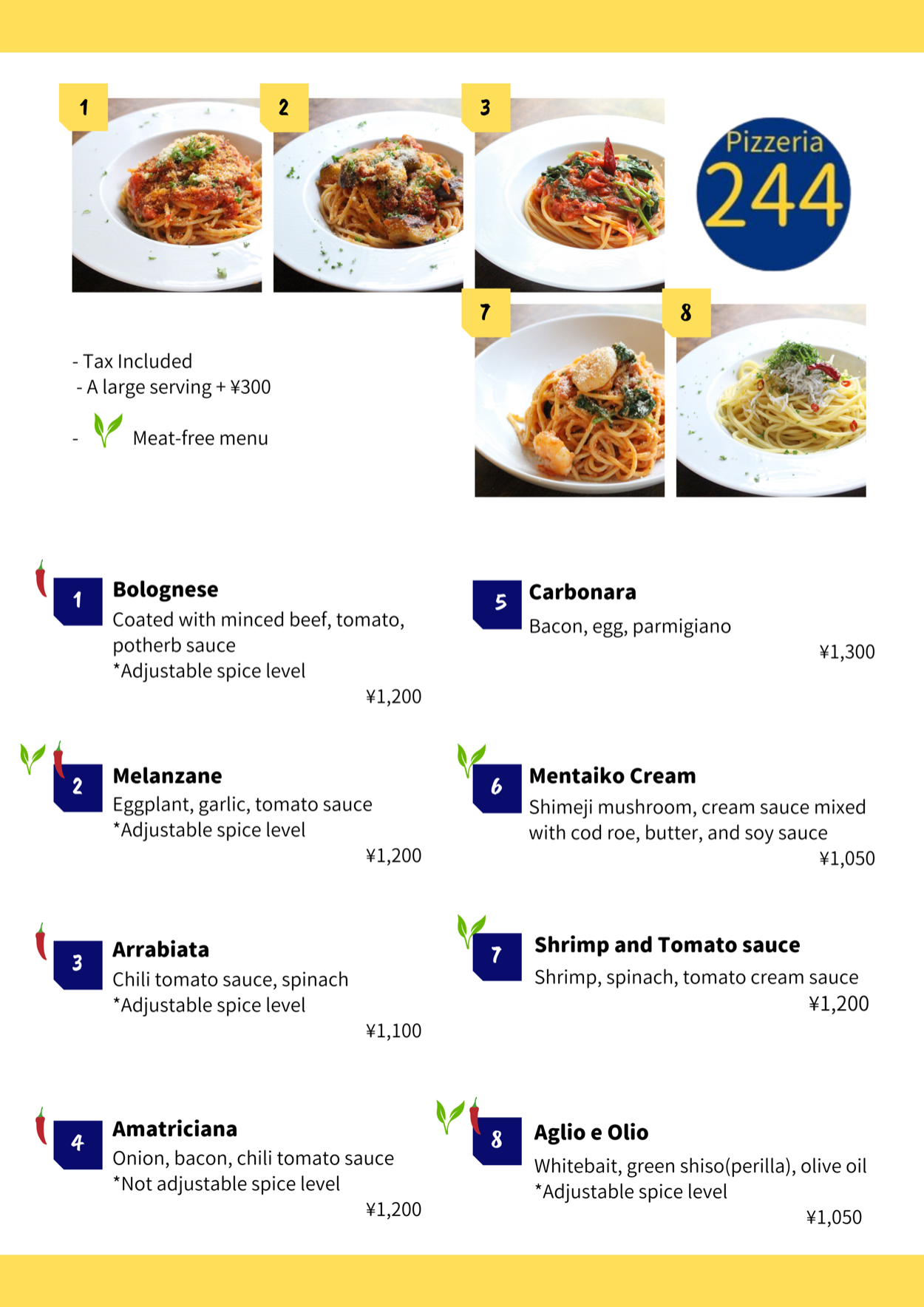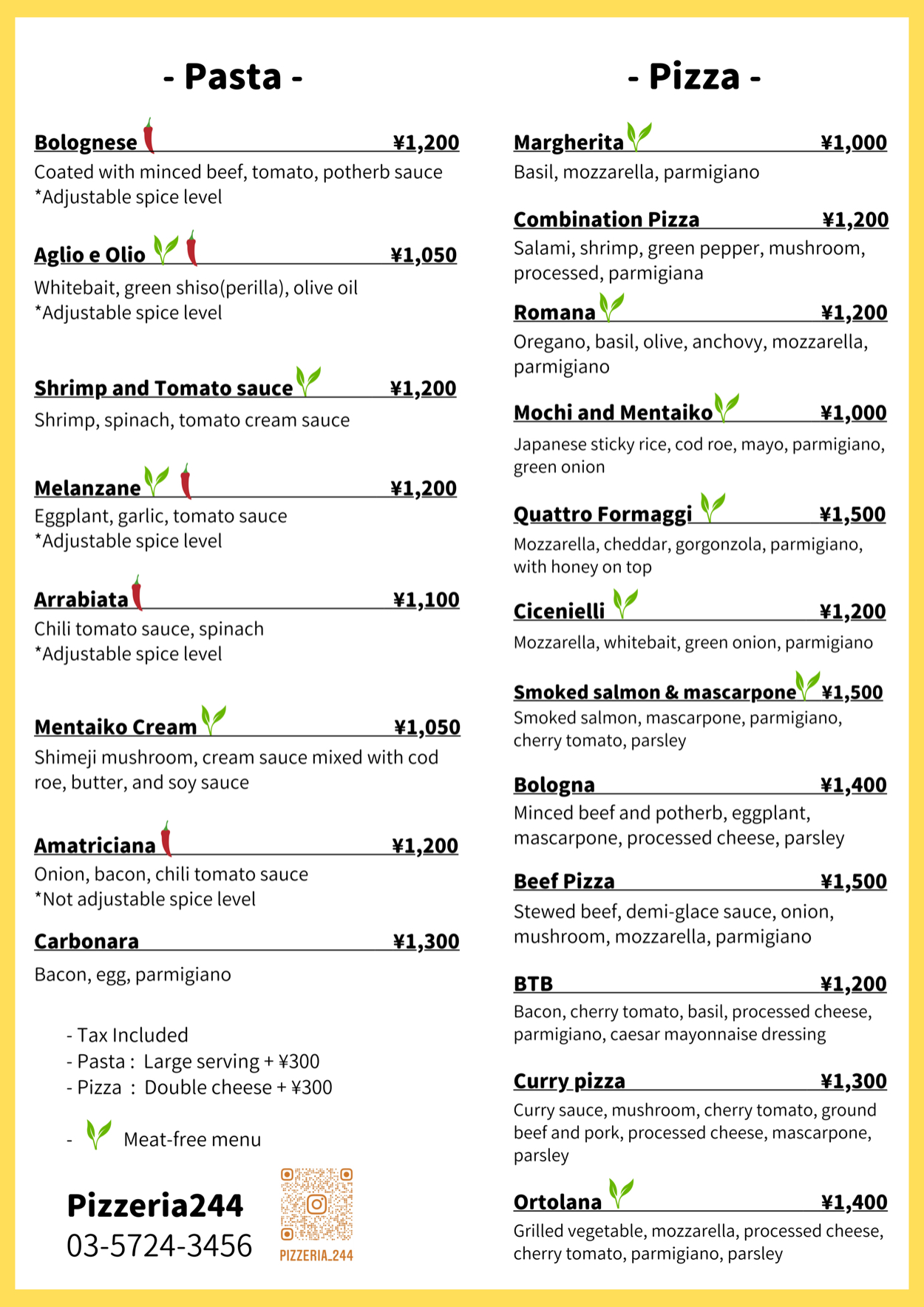 飲食店メニュー表 m.star OVERVIEW 外国のお客様にわかりやすいよう、英語メニューの作成をしました。 店内用メニュー・配布用テイクアウトメニュー YEAR 2020 アレルギーや食の指向の観点から選びやすいよう、具材の表記を徹底することが必須でしたそのため、他の文字情報を限りなく削ぐことに気をつけましたお店のイメージカラーである紺色と黄色をベースにしています