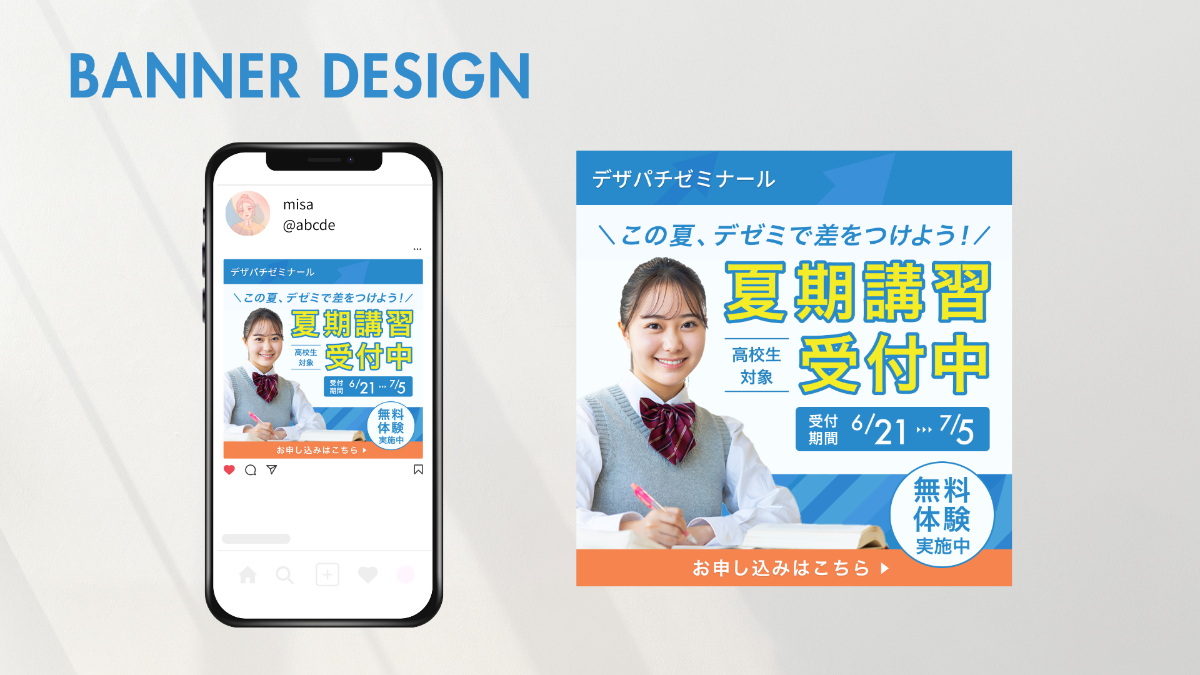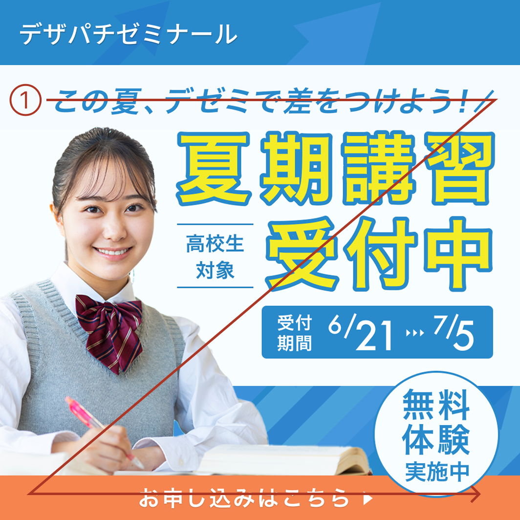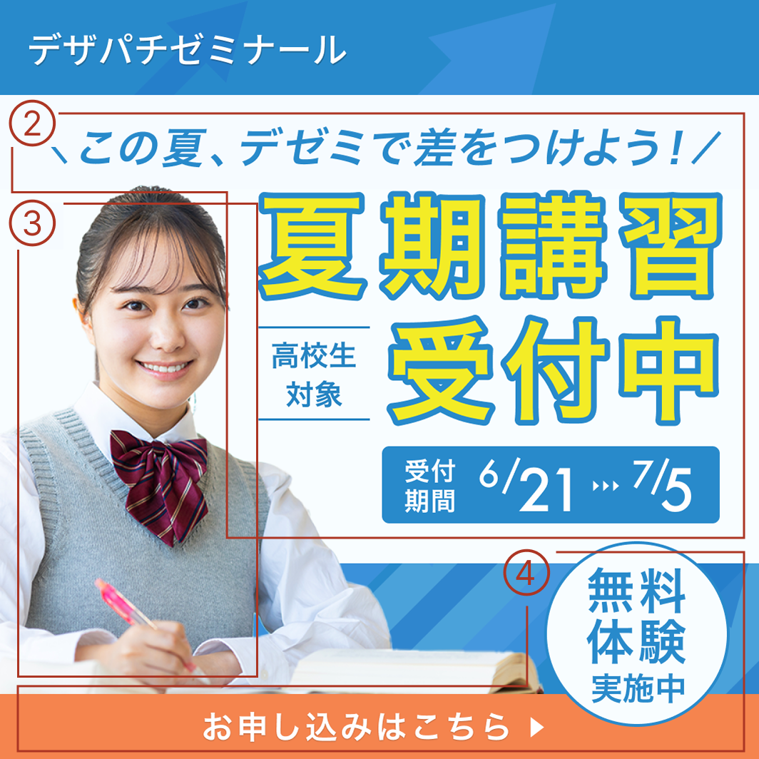 ①目線誘導を意識しZ型のレイアウトを採用。「夏期講習受付中」を目立たせることで目線を惹きつけ、サブコピー→タイトル情報→高校生の写真→CTAと行動を喚起するような流れを作成。【無料体験実施中】はCTA付近に配置することで、行動を後押しする狙いとなっている。
