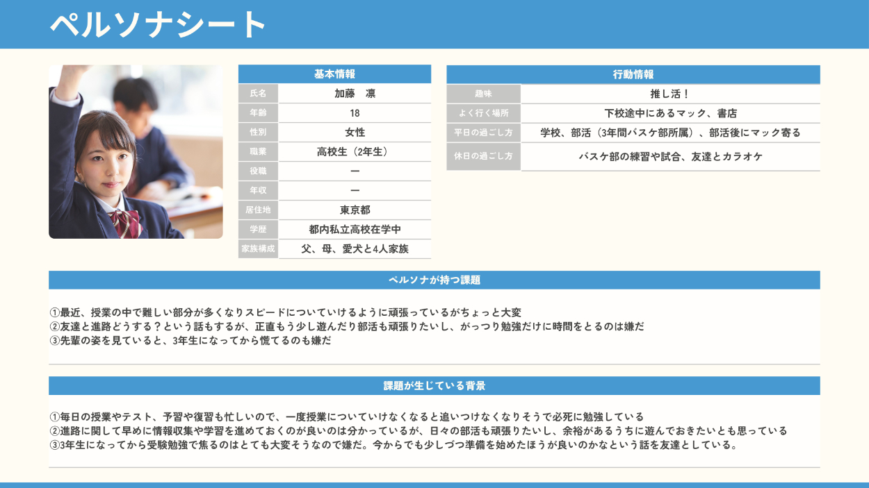 ③この先の学習効果や受験に向けてのポジティブなイメージを与えられるような学生の写真と、爽やかな世界観を意識。こちらに目線を向けている画像を選ぶことで、ユーザーに自分事と感じさせる狙いがある。