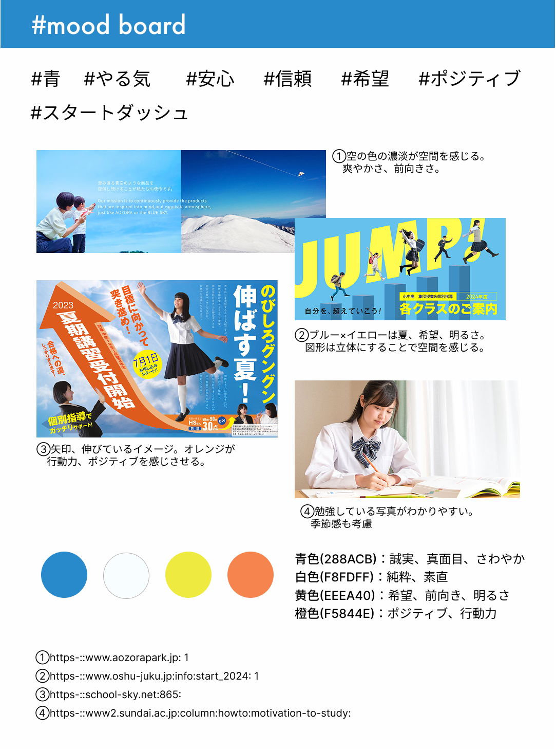 学習塾の、信頼、誠実をイメージさせるブルーをベースカラーに採用。これから成績を伸ばしていきたい、受験に向けいて飛躍していきたいという学生や保護者のかたの未来への勢い、希望も感じてもらえるようイエロー、オレンジも使用し行動力を後押しできるよう考慮した。