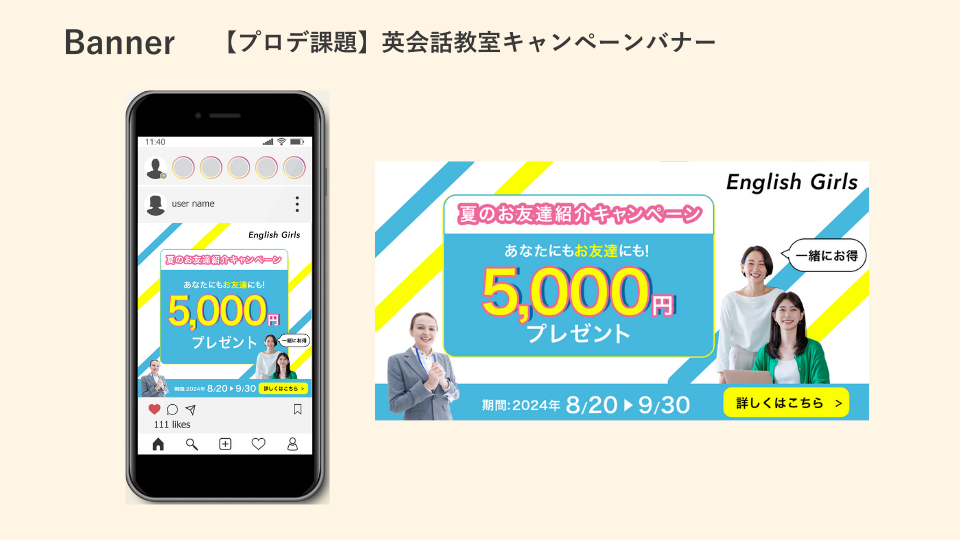 ・制作背景:英会話教室の夏のお友達紹介キャンペーンバナーを制作しました。