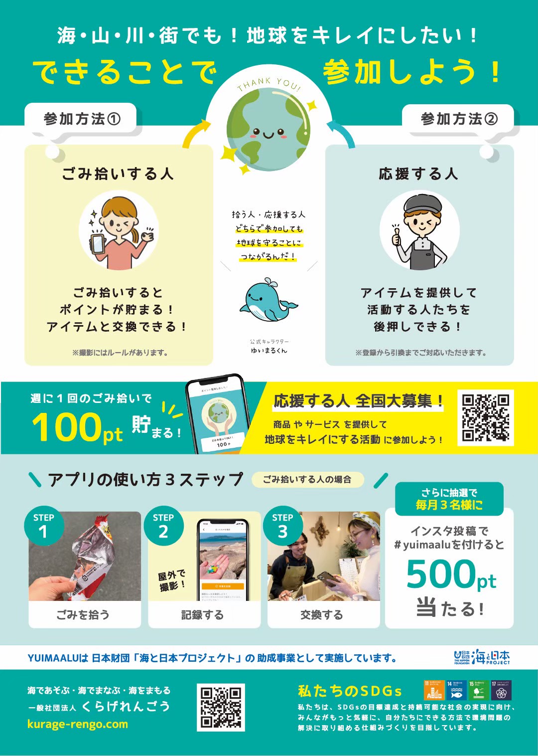 QR(ダウンロード)スマホ画面、ごみ拾いイメージイラスト、応援アイテム例の紹介