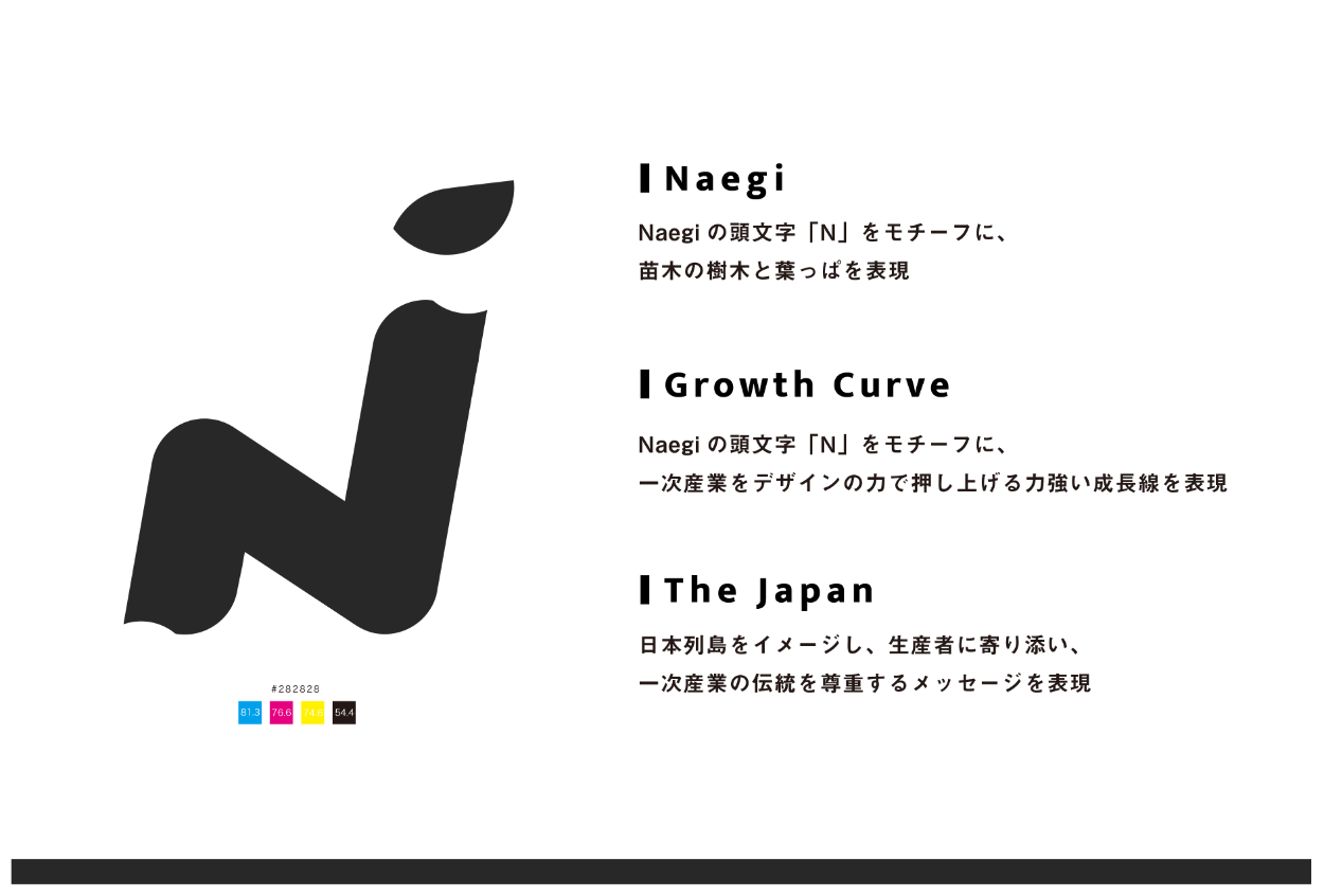 Naegiの頭文字「N」をモチーフに、一次産業をデザインの力で押し上げる力強い成長戦を表現。