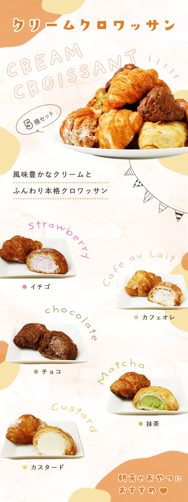 ・全体的にカフェっぽい雰囲気になるように、5種類のクロワッサンを写真を切り抜いて配置したり、ガーランドの素材を使用しました。
