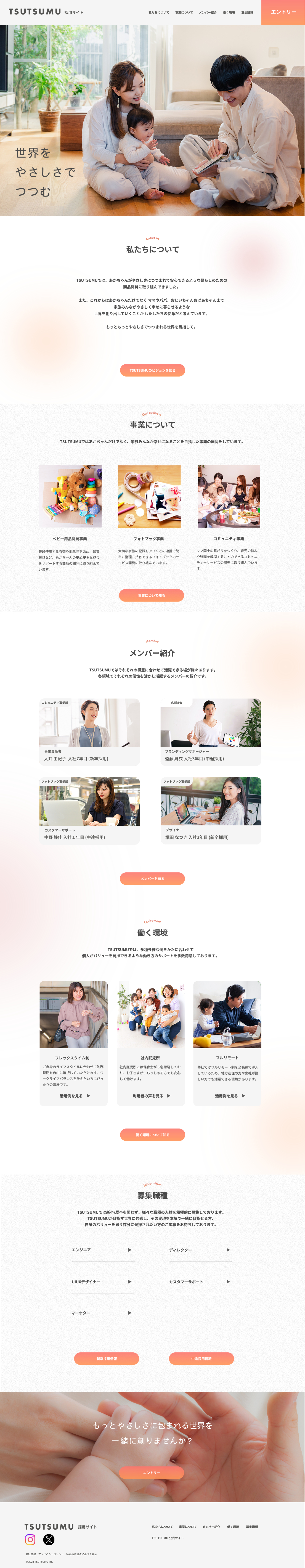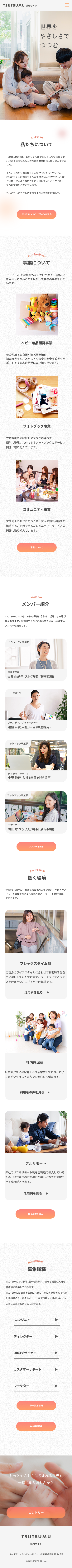 ▶家族写真で「温かさ」と「安心感」を最初に伝え、その後に「わたしたちについて」を配置することで企業の価値観や雰囲気を自然に理解してもらえる導線にしました。